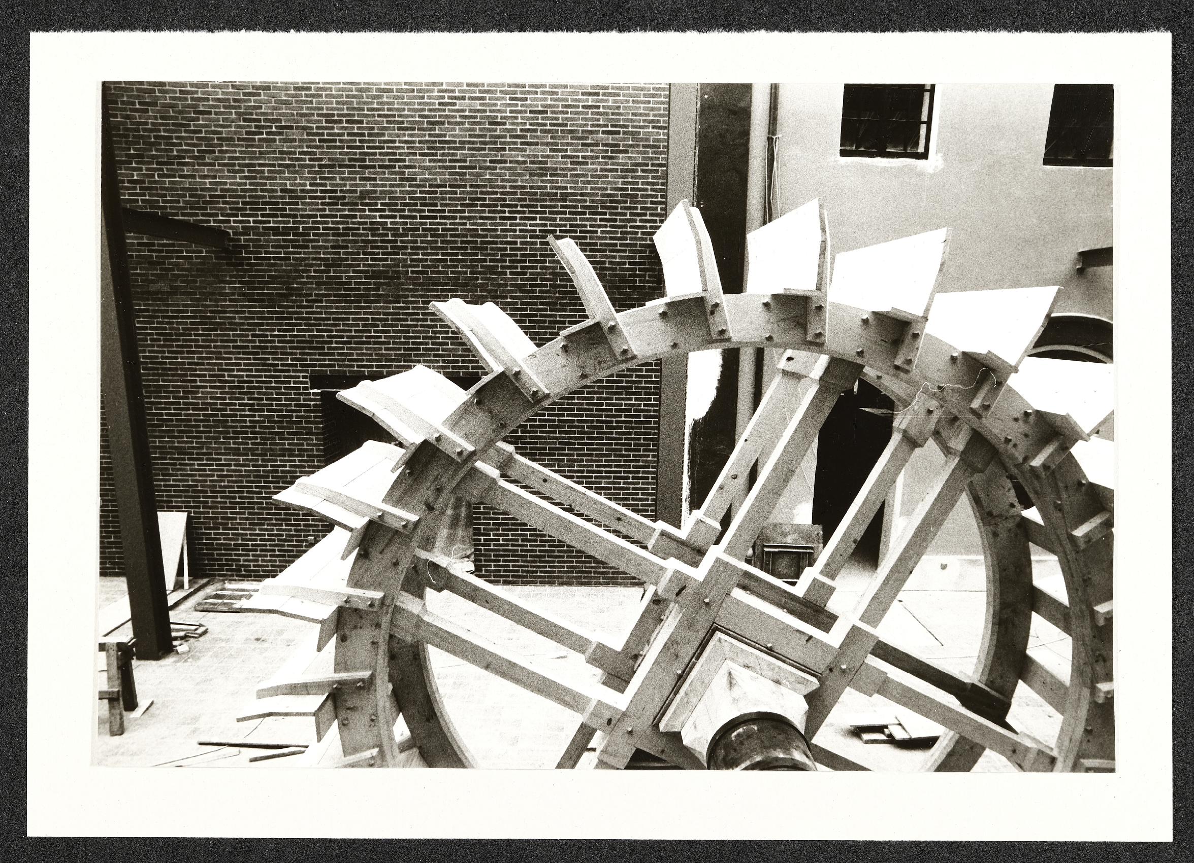 | Beschreibung | Aufbauarbeiten für die Landesausstellung 1987 "Arbeit - Mensch - Maschine" im Museum Industrielle Arbeitswelt Steyr: Mittelhalle, Wasserrad |