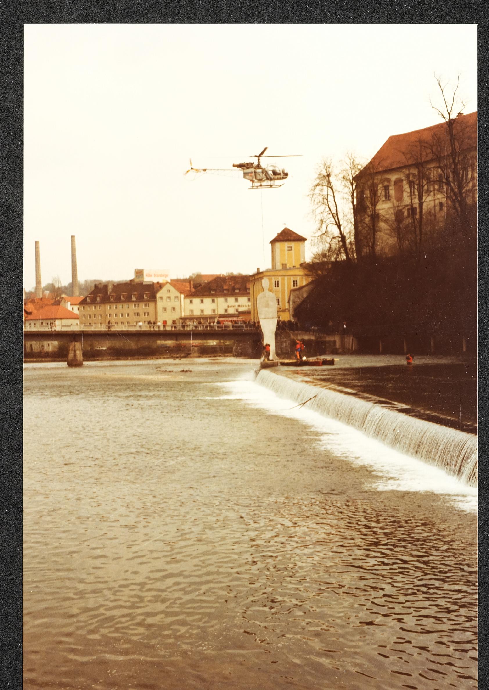 | Beschreibung | Montage des stählernen Menschens im Fluss Steyr im April 1991 |