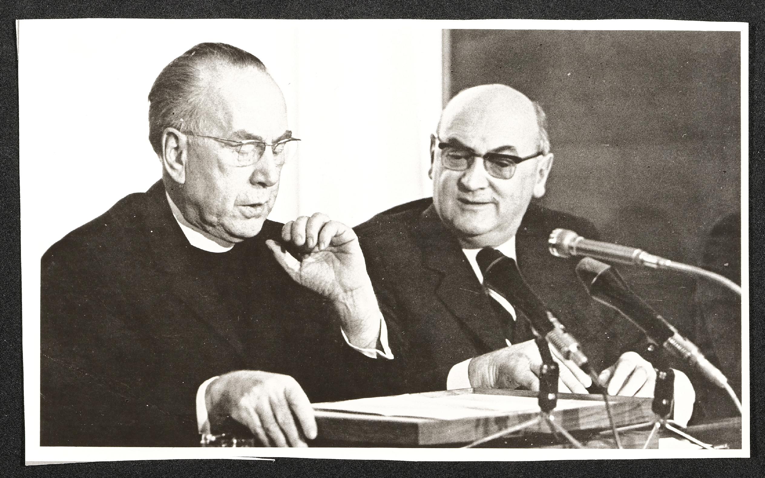 | Beschreibung | Kardinal König und ÖGB-Präsident Benya vor dem Bundesvorstand des Österreichischen Gewerkschaftsbundes (ÖGB) im Februar 1973 |