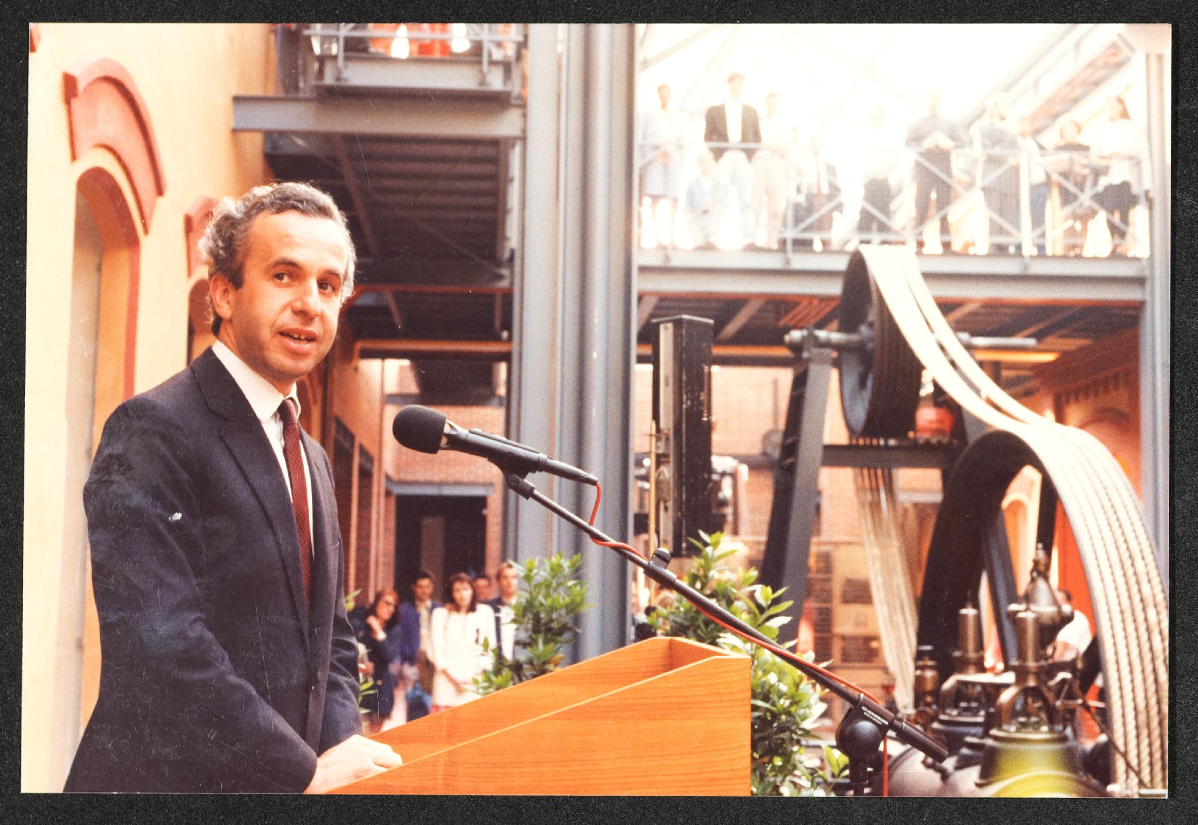 | Beschreibung | Landesausstellung 1987 "Arbeit - Mensch - Maschine" im Museum Industrielle Arbeitswelt Steyr: Eröffnung Info, Rede von Minister Scholten |