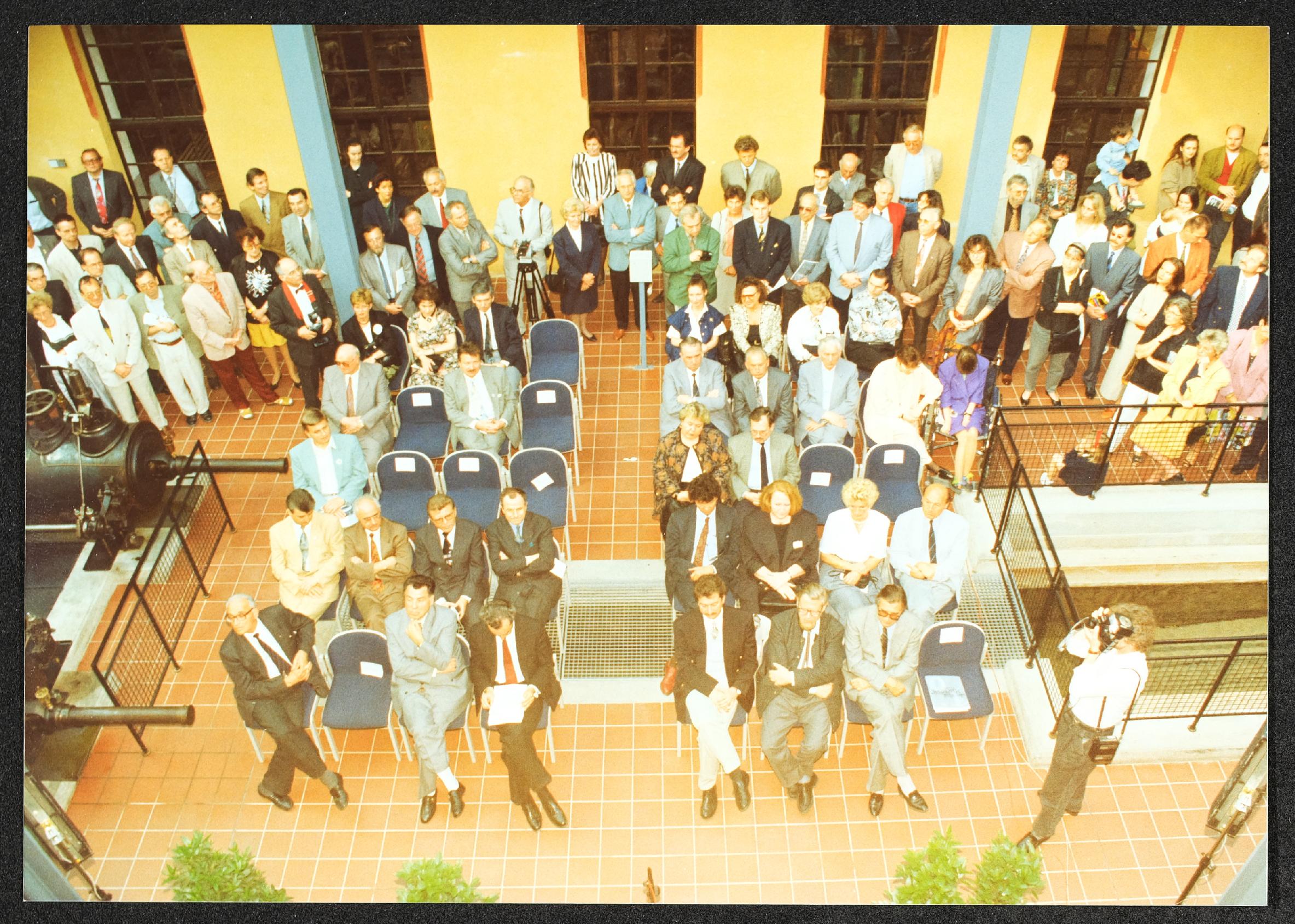 | Beschreibung | Landesausstellung 1987 "Arbeit - Mensch - Maschine" im Museum Industrielle Arbeitswelt Steyr: Eröffnung Info, Festgäste in der Mittelhalle |