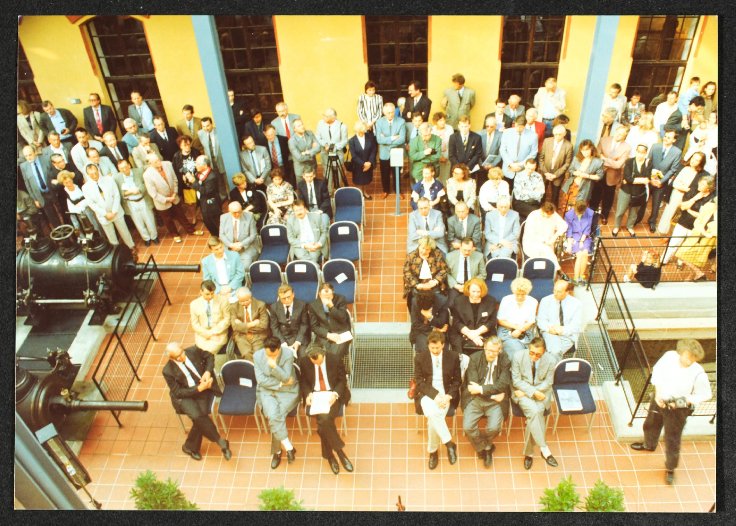 | Beschreibung | Landesausstellung 1987 "Arbeit - Mensch - Maschine" im Museum Industrielle Arbeitswelt Steyr: Eröffnung Info, Festgäste in der Mittelhalle |