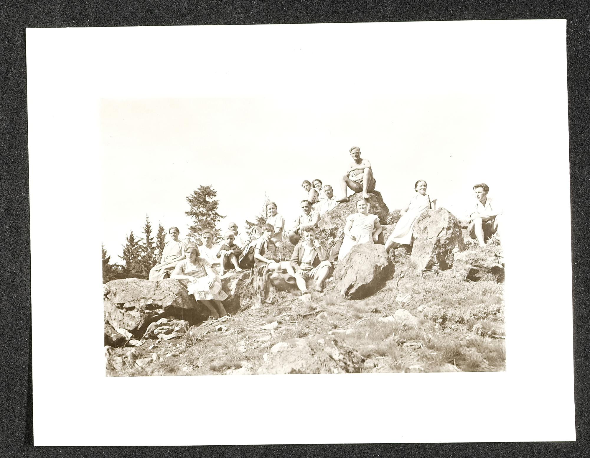 | Titel | Wandergruppe auf Felsen sitzend |