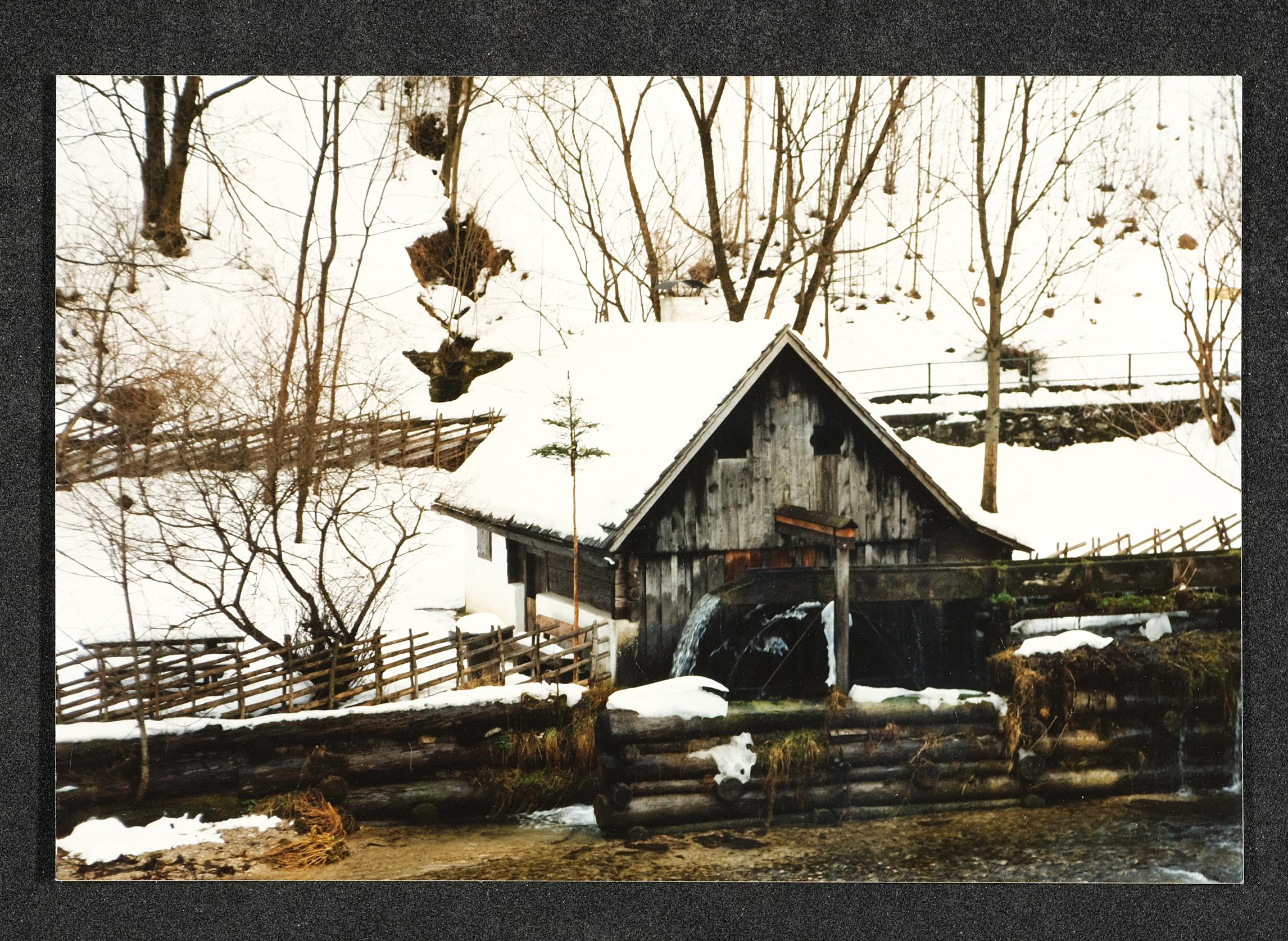 | Beschreibung | Katzensteinermühle (gebaut 1820) am Gaflenzbach in Weyer , Museumsmühle mit Wasserrad und Troadkasten, im Winter 1995 |