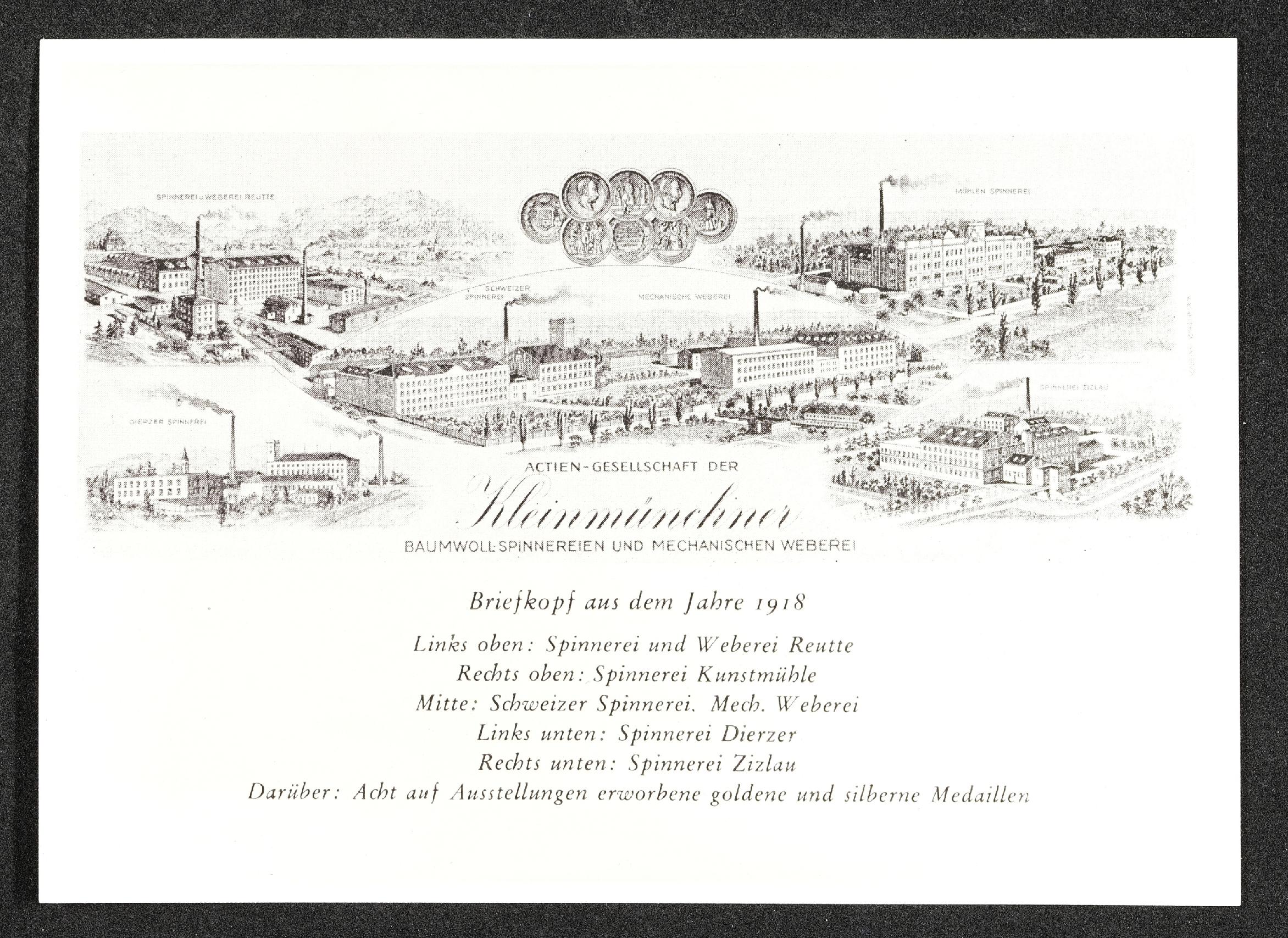 | Beschreibung | Anlagen der Kleinmünchner Baumwoll-Spinnerei und mechanischen Weberei, Briefkopf aus dem Jahr 1918 |