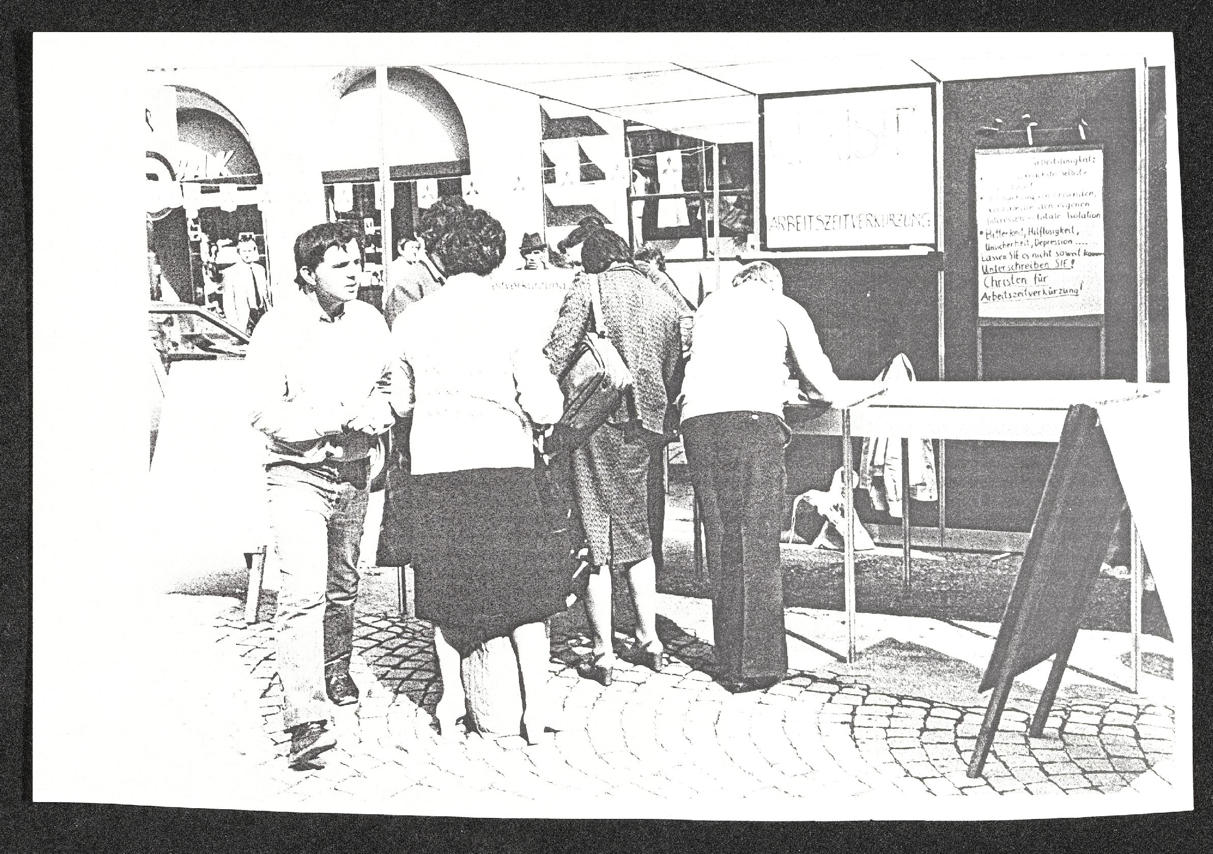 | Beschreibung | Info-Stand der Katholischen Arbeiterbewegung (KAB) in den 1980er-Jahren, die für die Arbeitszeitverkürzung eintritt |