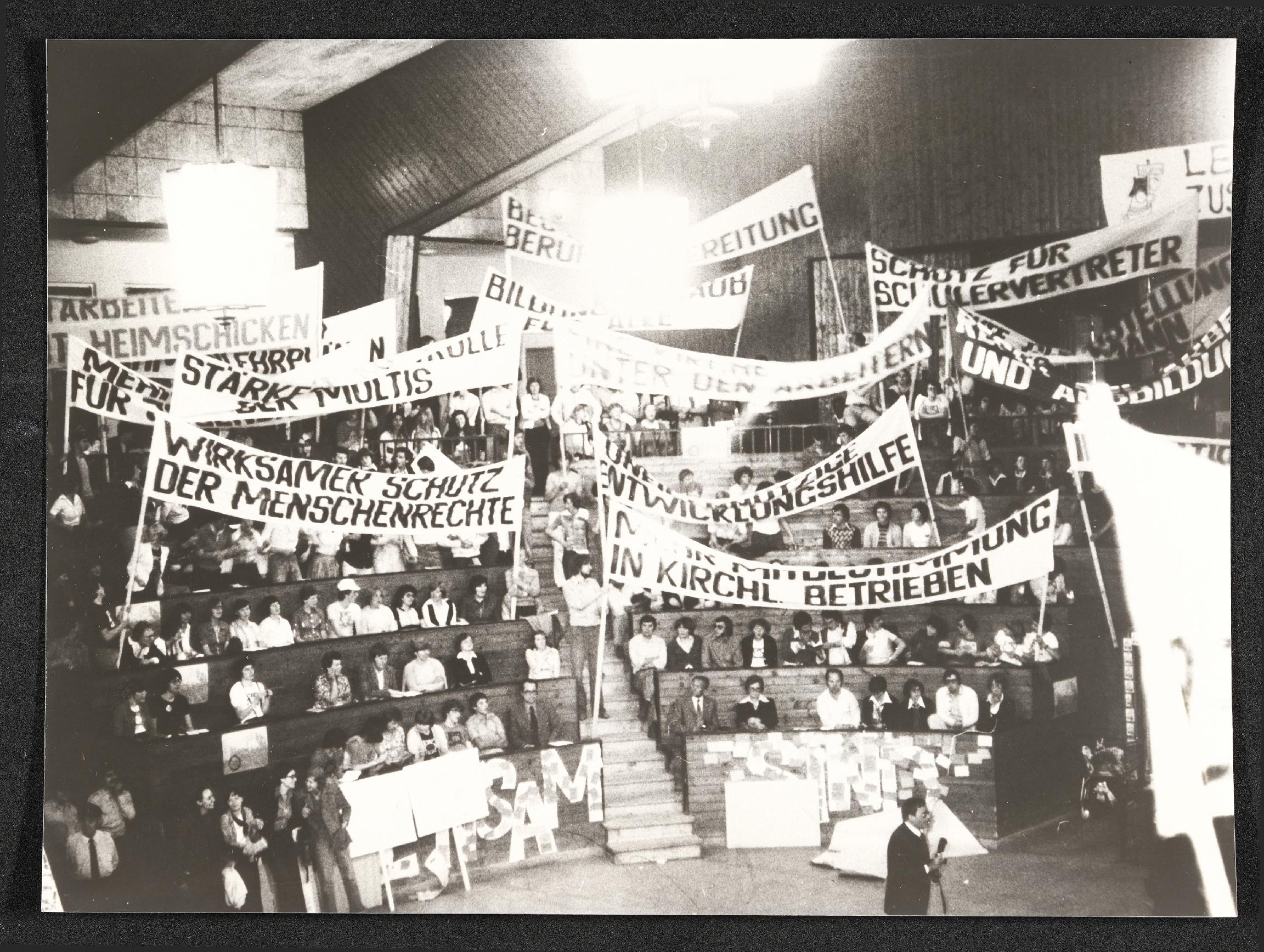 | Beschreibung | In den 1980er-Jahren werden bei einer Veranstaltung Transparente zum Thema Schutz der Menschenrechte und sozialer Werte entrollt. Nähere Daten sind nicht bekannt. |