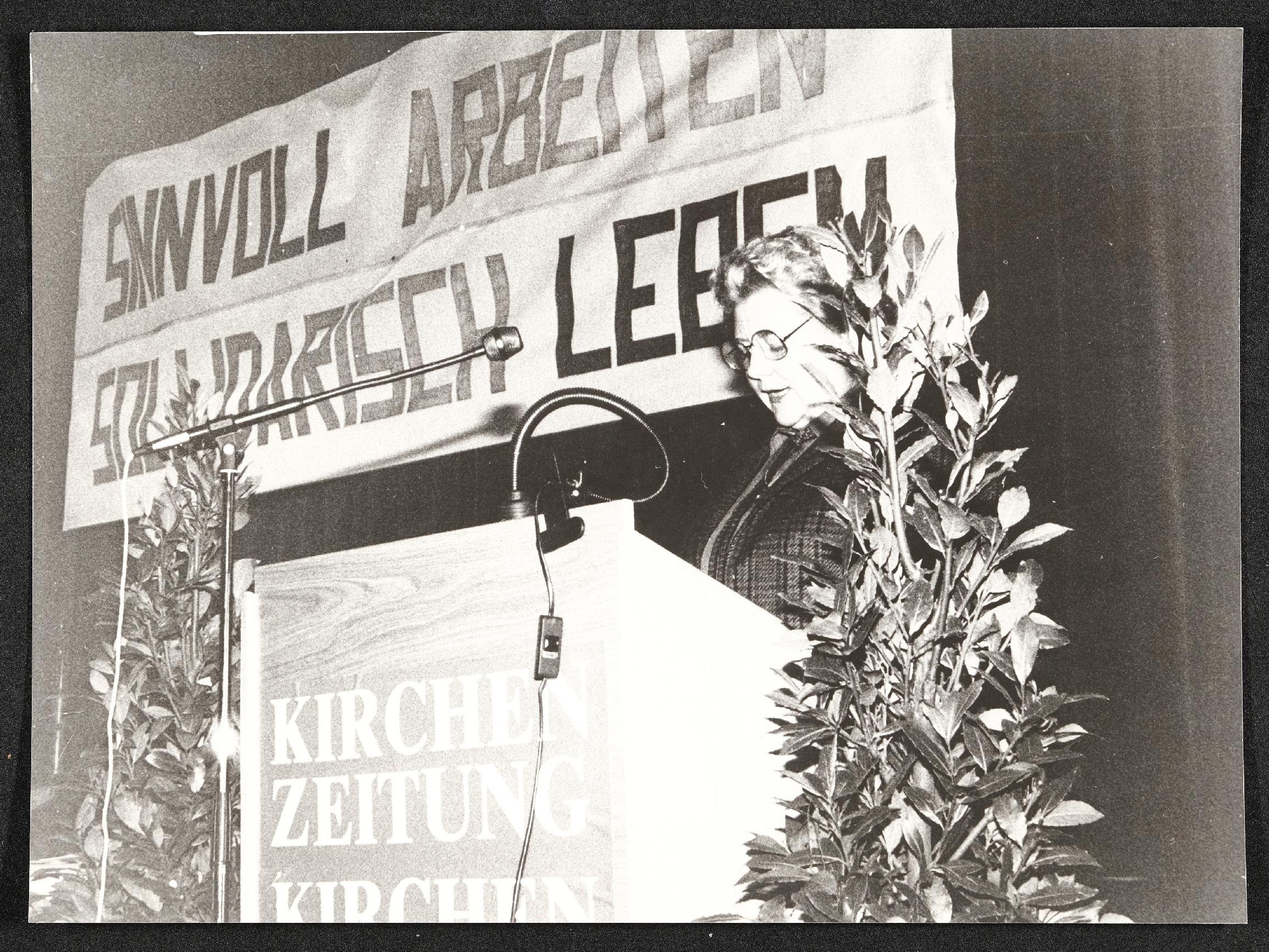 | Beschreibung | Diskussionsveranstaltung der Kirchenzeitung zum Sozialhirtenbrief am 18. November 1988, Rede der Welser SP-Vizebürgermeisterin Adele Podlaha |