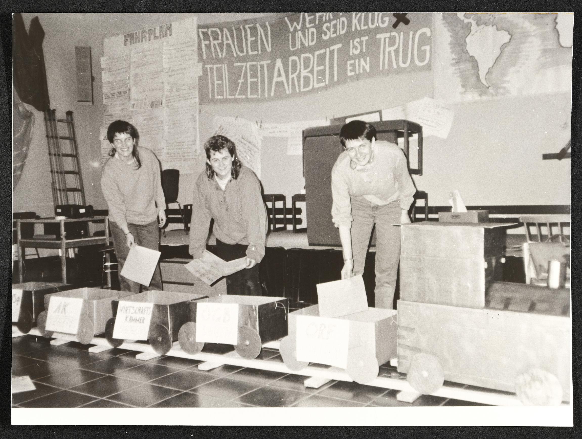| Beschreibung | Spektakel vom 28. bis 29. April 1990 zum Projekt "Pech, Marie ?!" der Katholischen Arbeiterjugend (KAJ), im Bild: Sieglinde Grünseis, Marie Steindl, Ingrid Jehle |