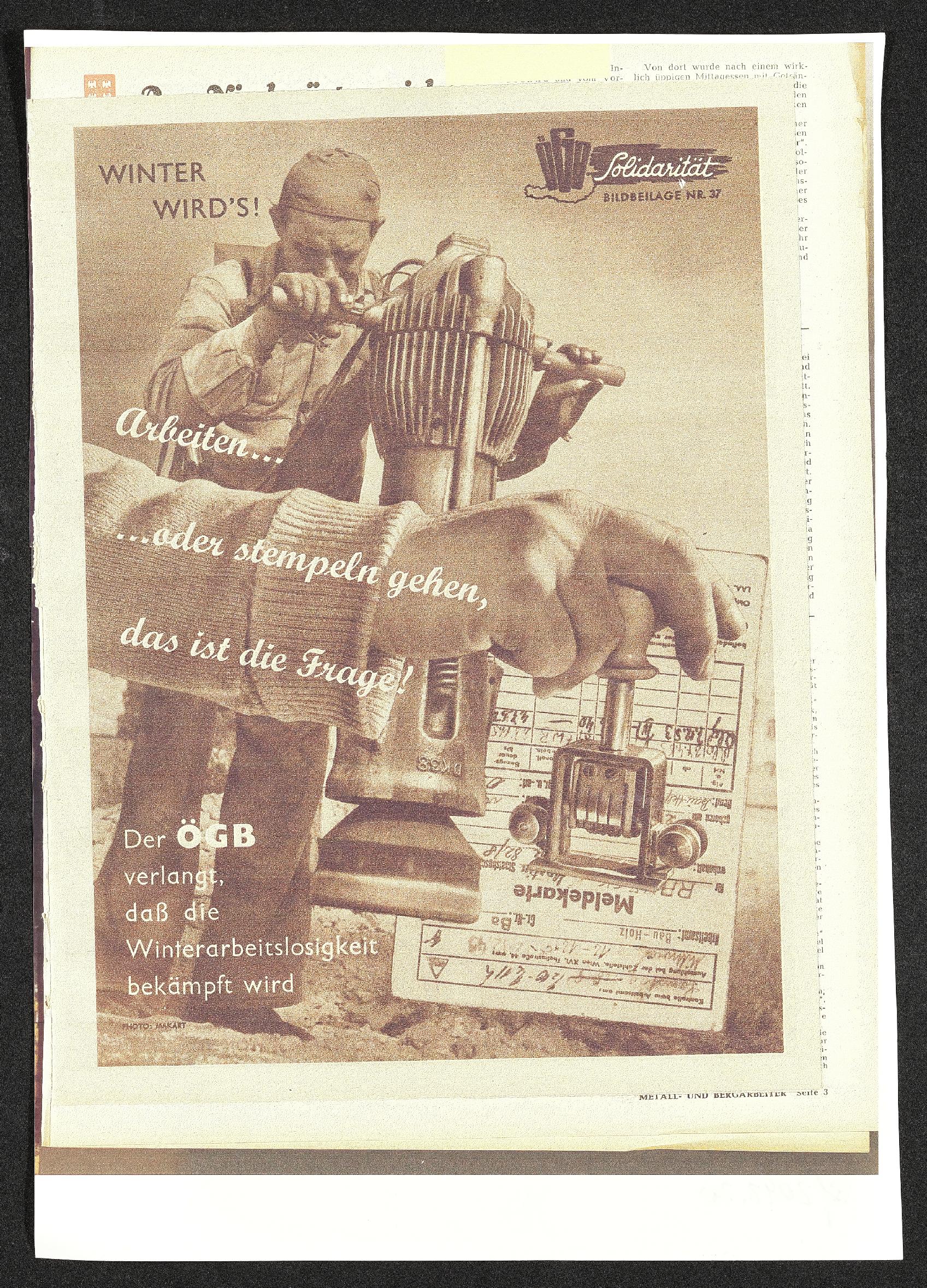 | Beschreibung | Der Österreichische Gewerkschaftsbund (ÖGB) setzt sich gegen die Winterarbeitslosigkeit ein, Beilage zur Novemberausgabe der Zeitschrift Solidarität |