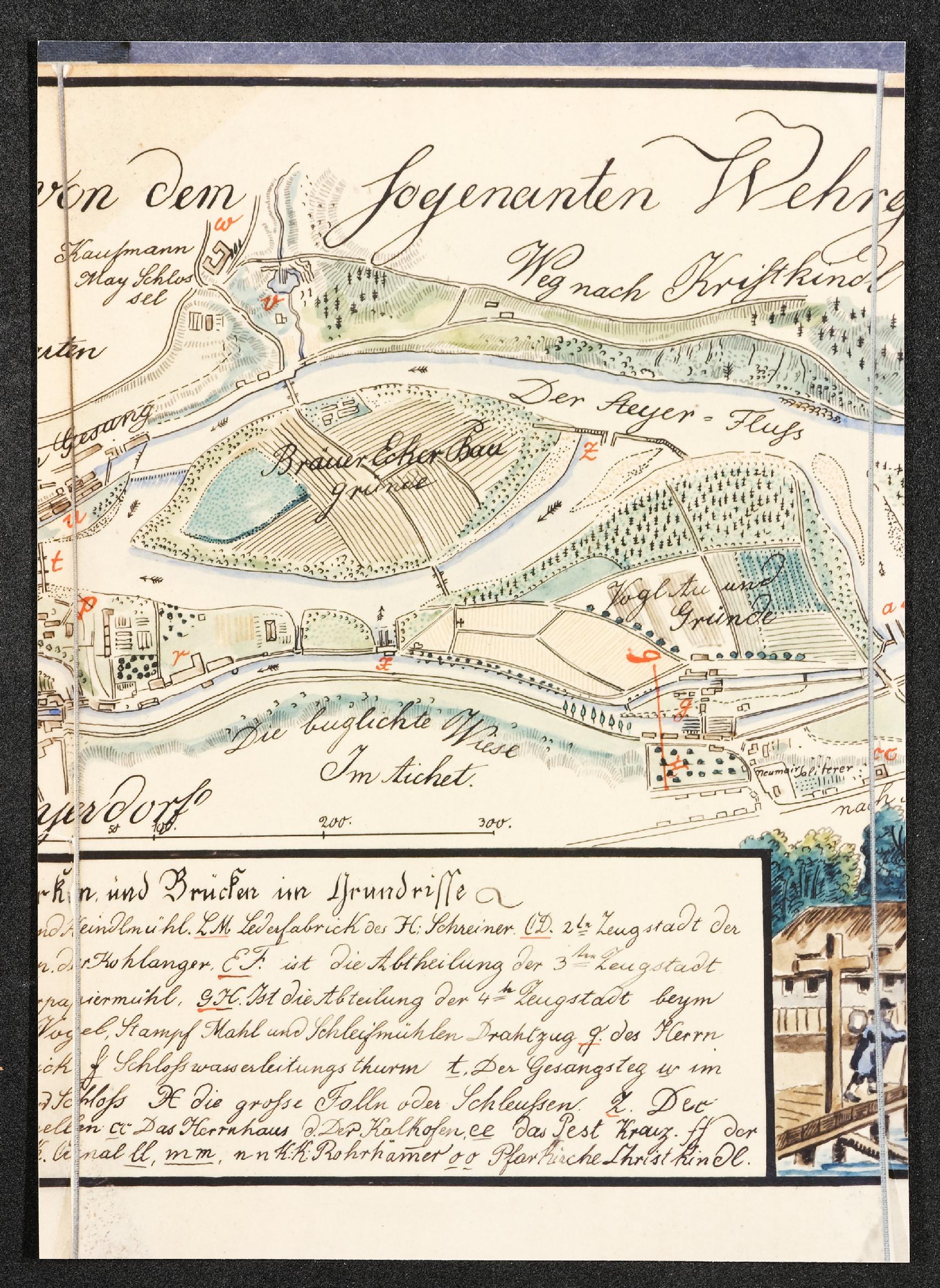 | Beschreibung | Detailansicht der Zeichnung aus: "Der Wehrgraben - Topographisch statistisch technische Beschreibung 1.Heft von 1832" (Originalmanuskript im Archiv der Stadt Steyr Nr. 339/a), 1830: Originalzeichnung von Joseph Löw (*1770, +1842), 1948: Abschrift der unteren Hälfte der Originalzeichnung |