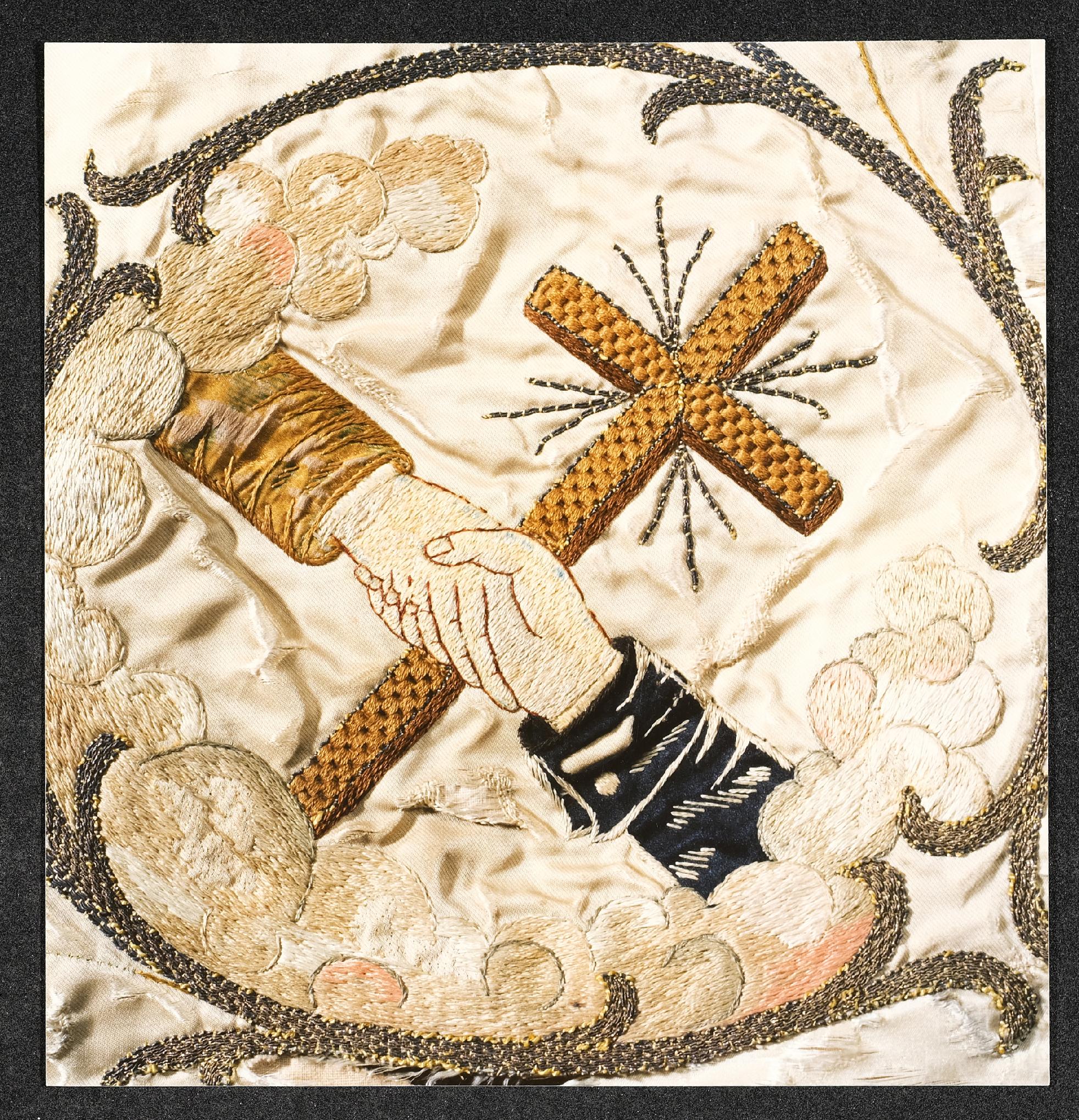 | Beschreibung | Detail der Vereinsfahne des Katholischen Gesellenvereines: Grußhände mit Kreuz |