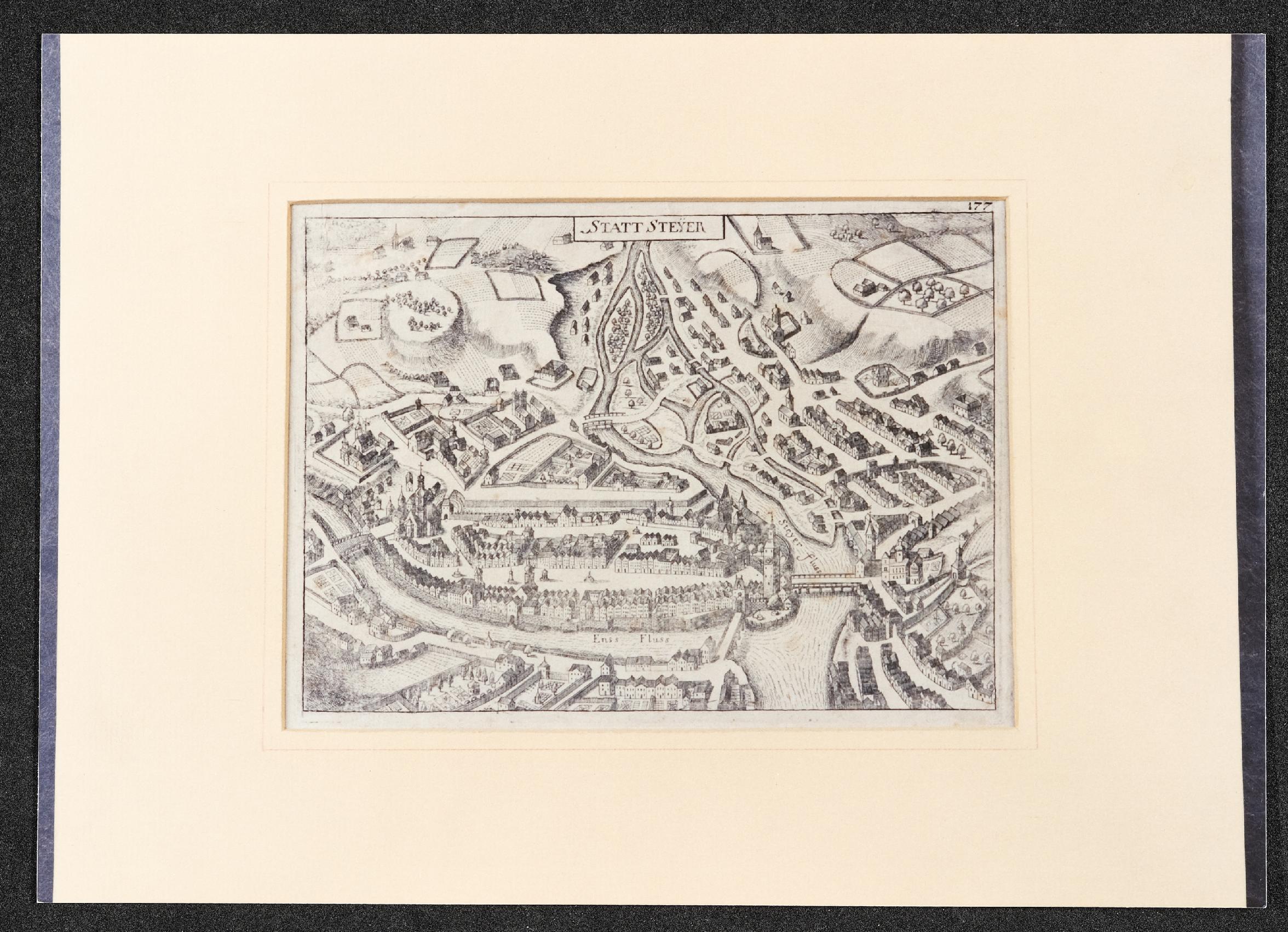 | Beschreibung | Stich nach Matthäus Merian der Ältere (*1593, +1650). Das Original befindet sich im Stadtmuseum Steyr. |