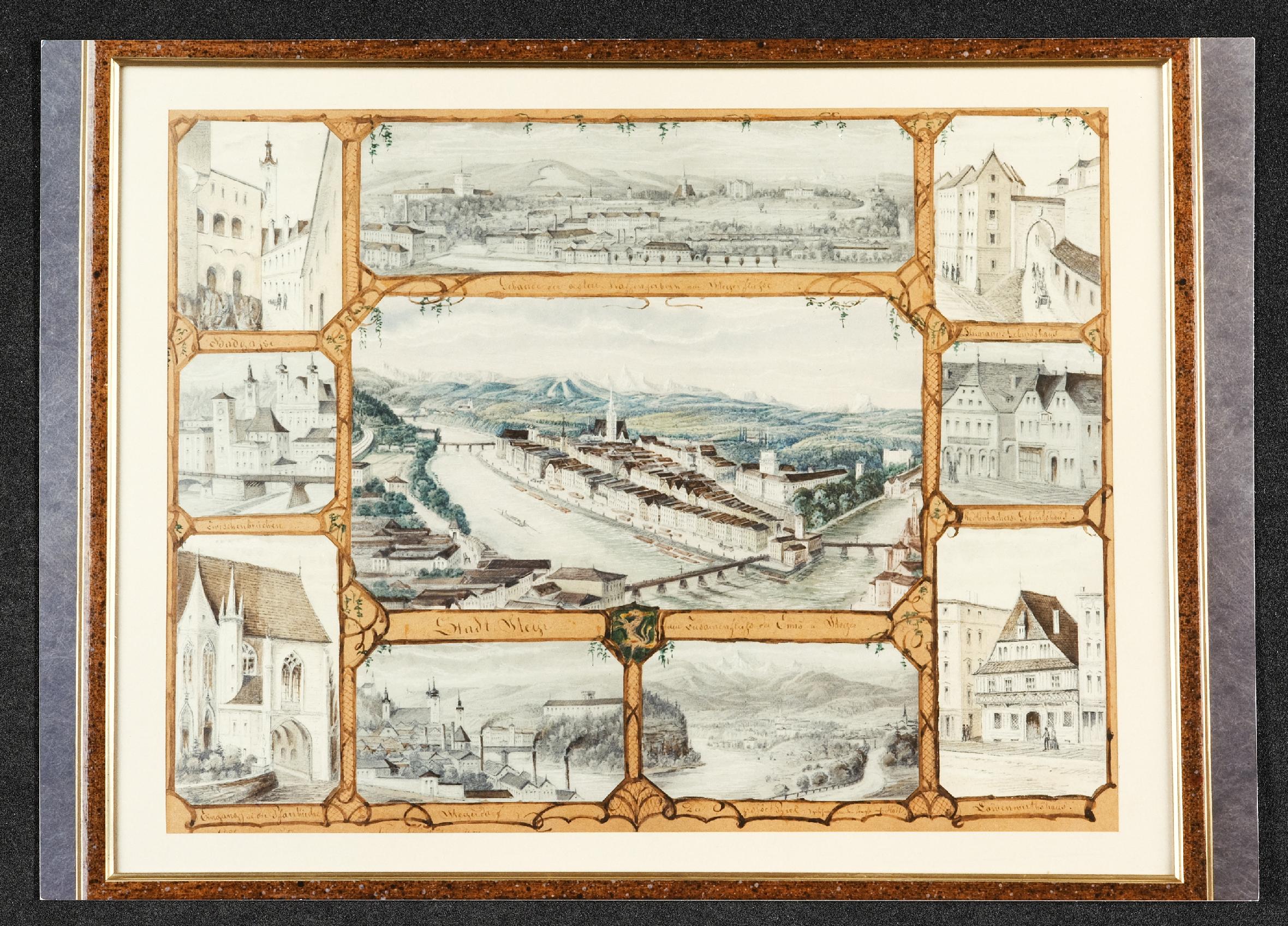 | Beschreibung | Stadtansichten von Steyr, zehn kleine Aquarelle auf Karton von Franz Hölzlhuber (*22. September 1826, +4. Februar 1898) |