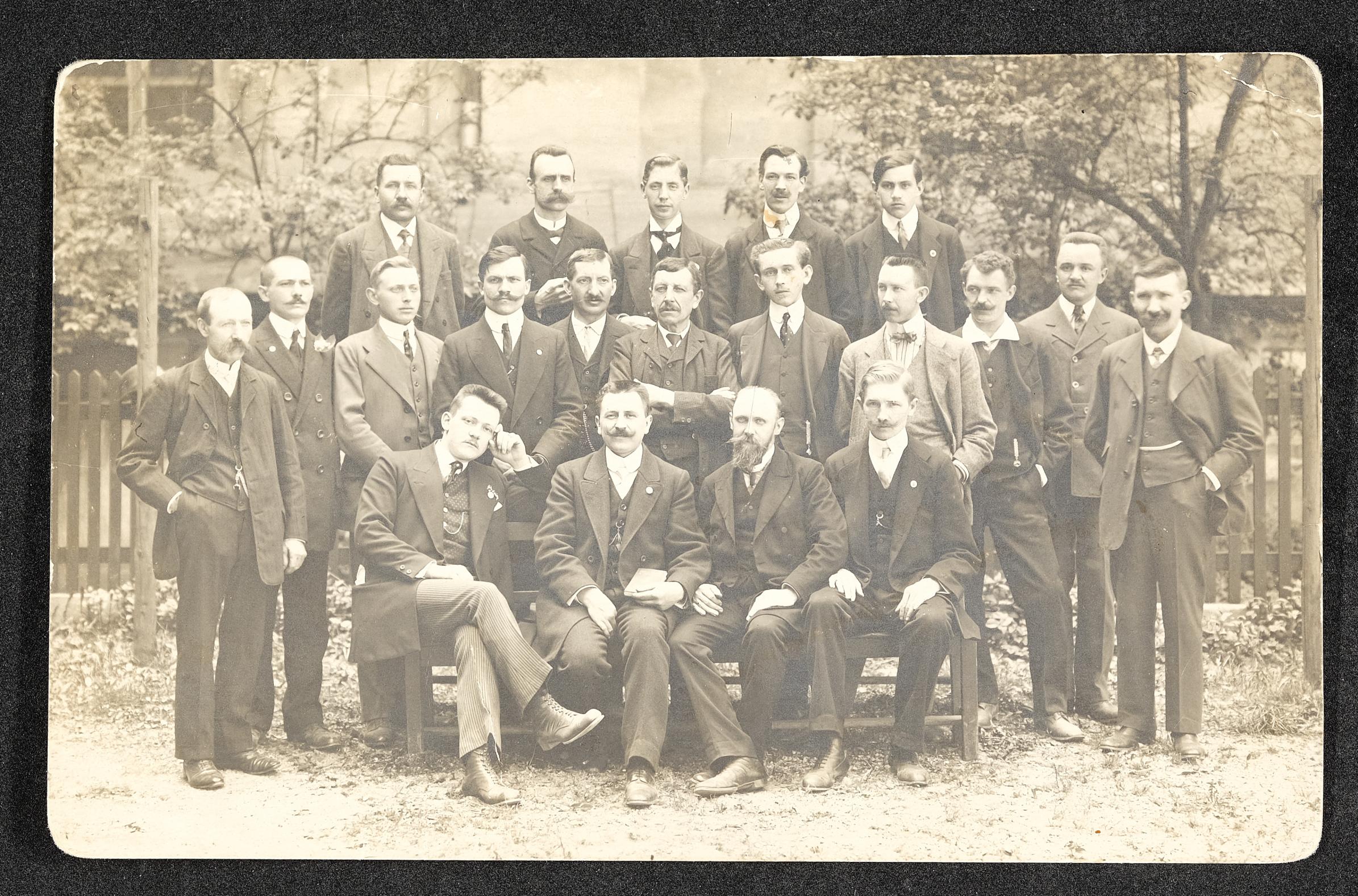 | Beschreibung | Foto des Metallarbeiterverband-Vorstandes von Steyr im Jahr 1915. Frontreihe: Schmied Rob., Klement Karl, Wokral Josef (*26. Jänner 1875, +2. April 1926, Politiker SDAP, Bürgermeister in Steyr), Link Paul., 2.Reihe: von links Vogl, Kreisel und Fischer. |