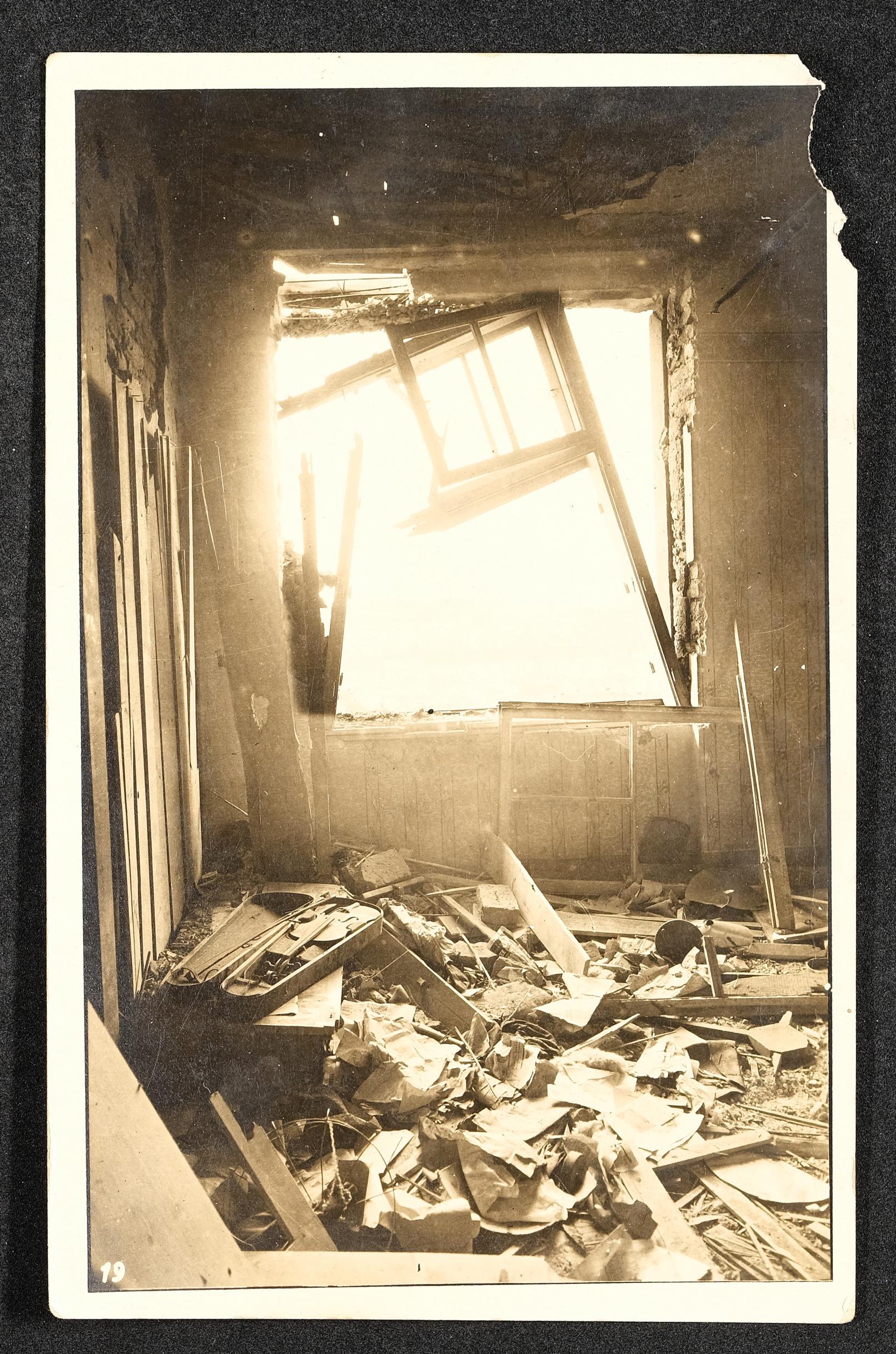 | Beschreibung | Ansichtskarte mit Foto einer zerstörten Wohnung (mit Geigenkasten) in Steyr. Aufnahme von Photo K. Them, Steyr. |
