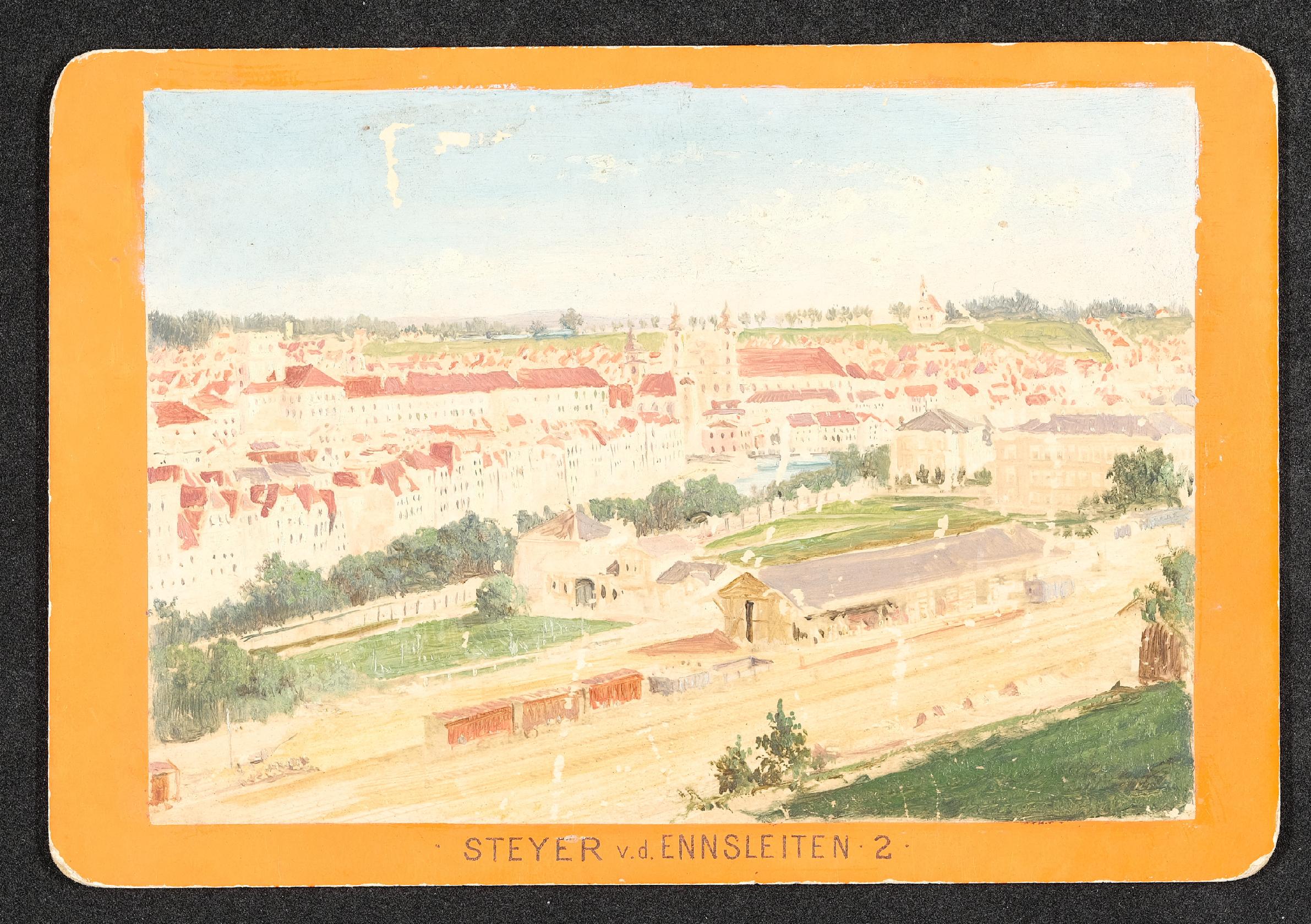 | Beschreibung | Ansicht von Steyr von der Ennsleite aus gesehen - mit Schloss Lamberg - Michaelerkirche - Taborturm |