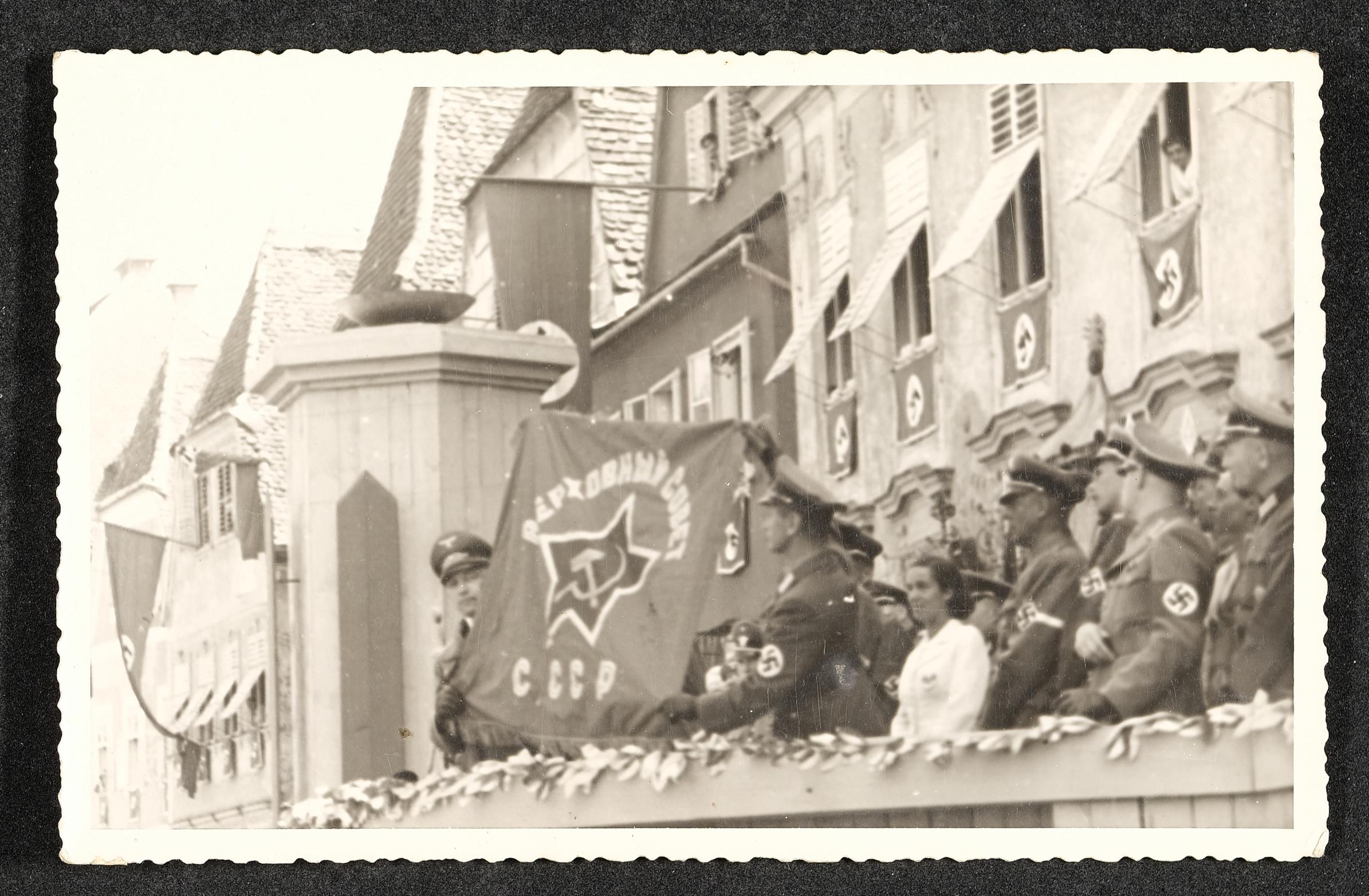 | Beschreibung | Der Gauleiter von Oberdonau August Eigruber spricht 1941 auf dem Steyrer Stadtplatz. Während der Propagandaveranstaltung wird die sowjetische Fahne der eroberten Festung von Brest-Litowsk hergezeigt. |