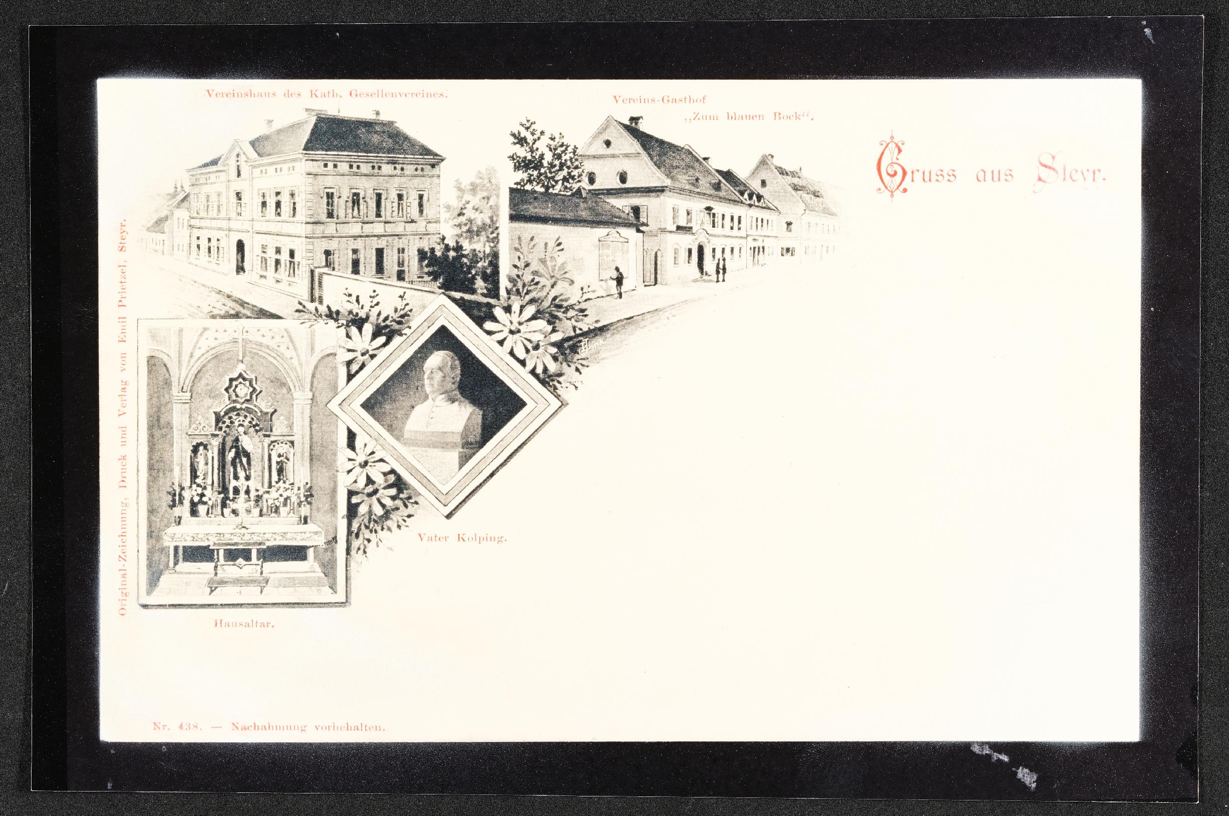| Beschreibung | Abzug nach Postkarte (vor 1914): Katholischer Gesellenverein, Vereinshaus, Vereinsgasthof Zum blauen Bock, Hausaltar, Vater Kolping |