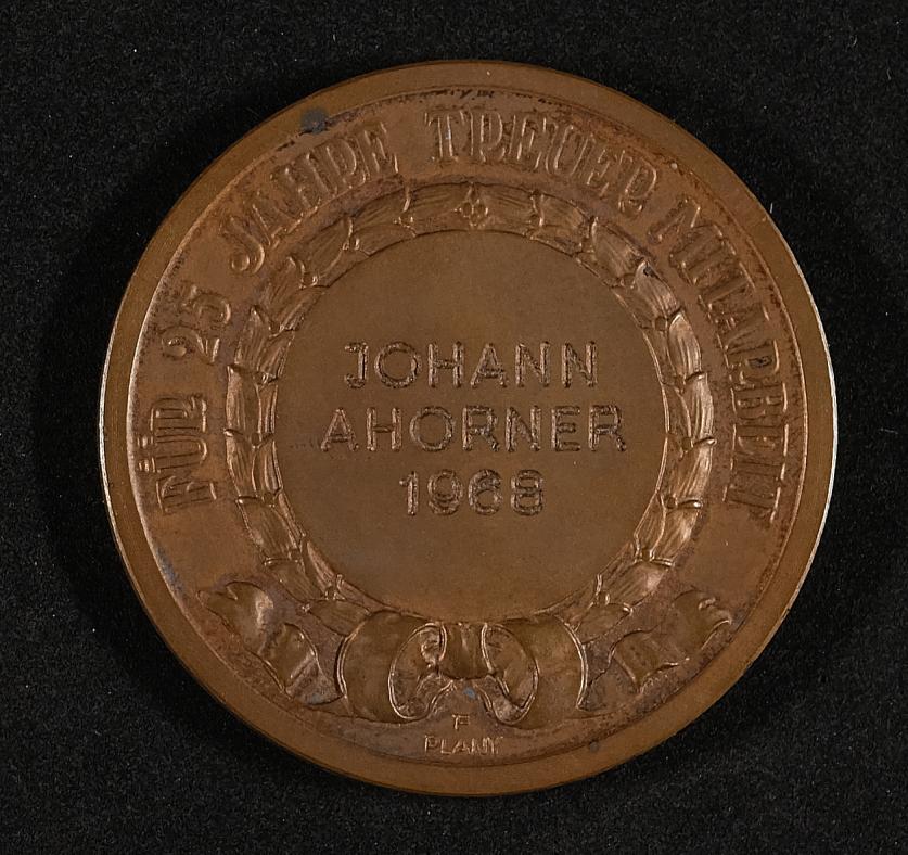 | Beschreibung | Medaille der Handelskammer, für 25 Jahre treuer Mitarbeit, Johann Ahorner, 1968 |