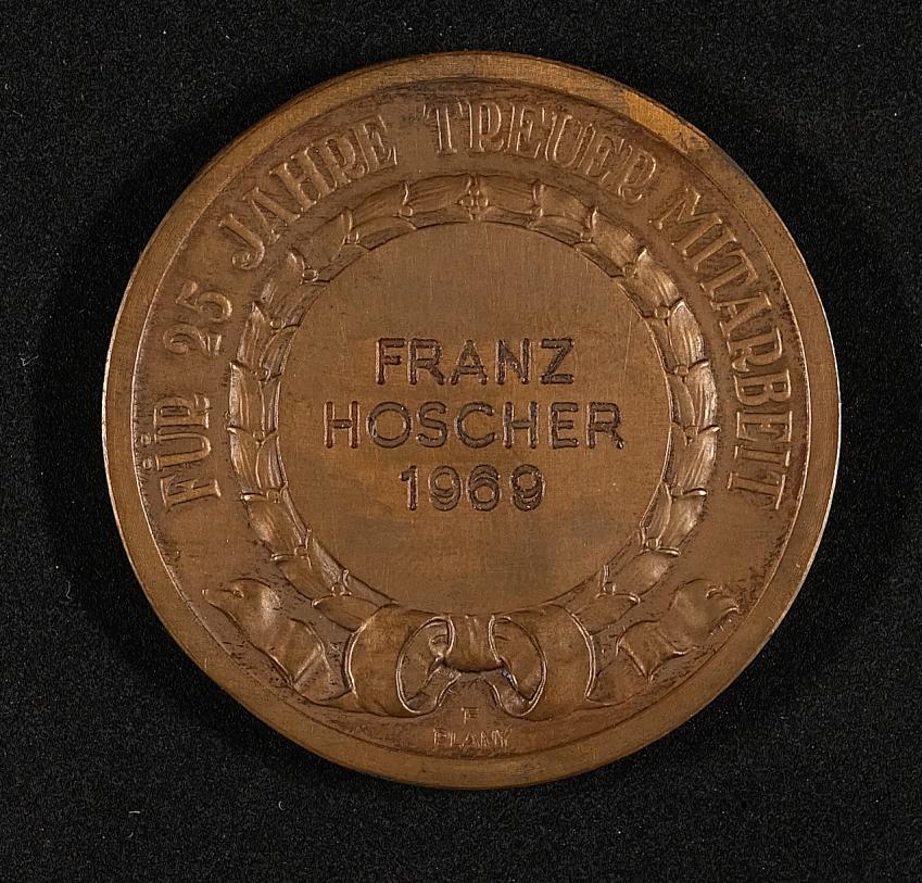 | Beschreibung | Medaille der Handelskammer, für 25 Jahre treuer Mitarbeit, Franz Hoscher 1969, Steyr-Daimler-Puch AG |