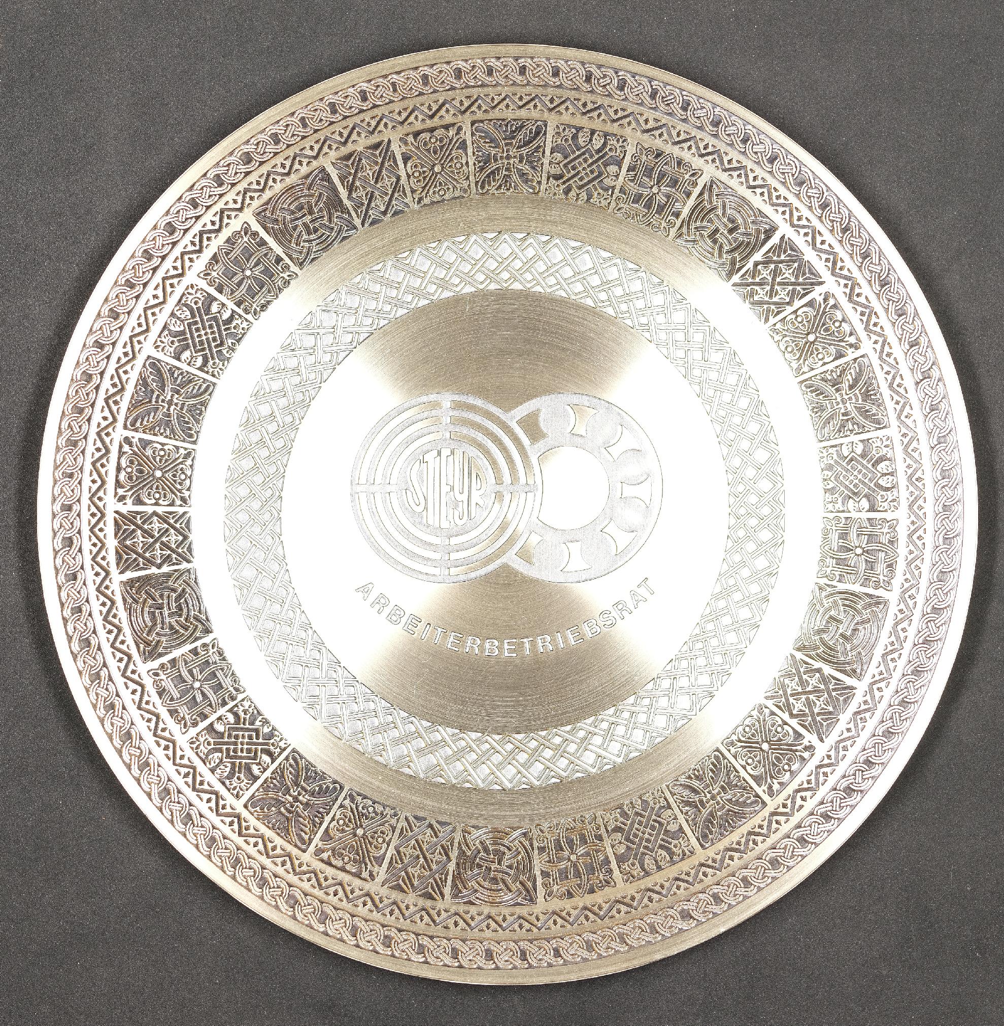 | Beschreibung | Zierteller, Abschiedsgeschenk des Arbeitrerbetriebsrates der Steyr-Daimler-Puch AG anlässlich der Pensionierung |