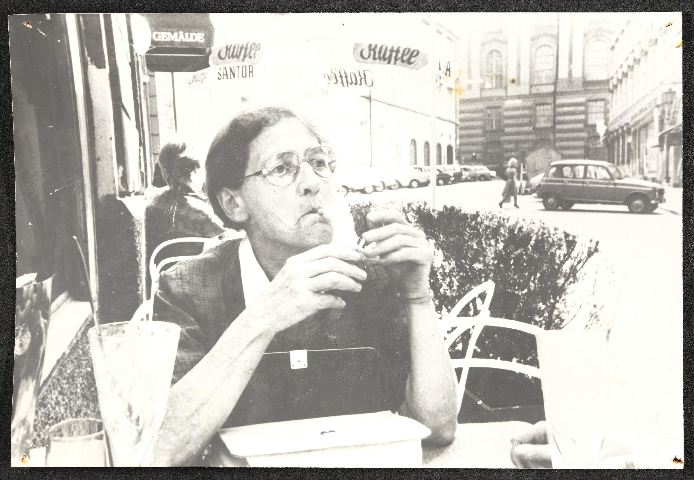 | Beschreibung | Frau in einem Gastgarten |
