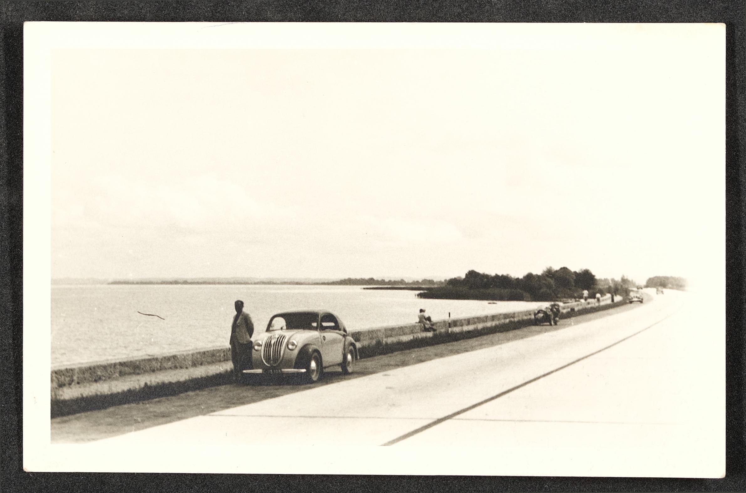 | Beschreibung | Foto eines Reisenden, der sein Auto am Straßenrand parkt und aufs Wasser blickt. |