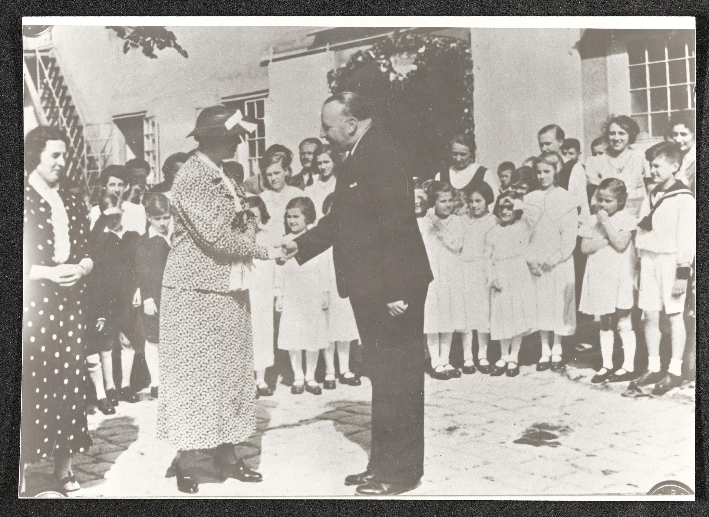 | Beschreibung | Ein Mann begrüßt eine Frau, im Hintergrund stehen festlich gekleidete Kinder und Erwachsene |