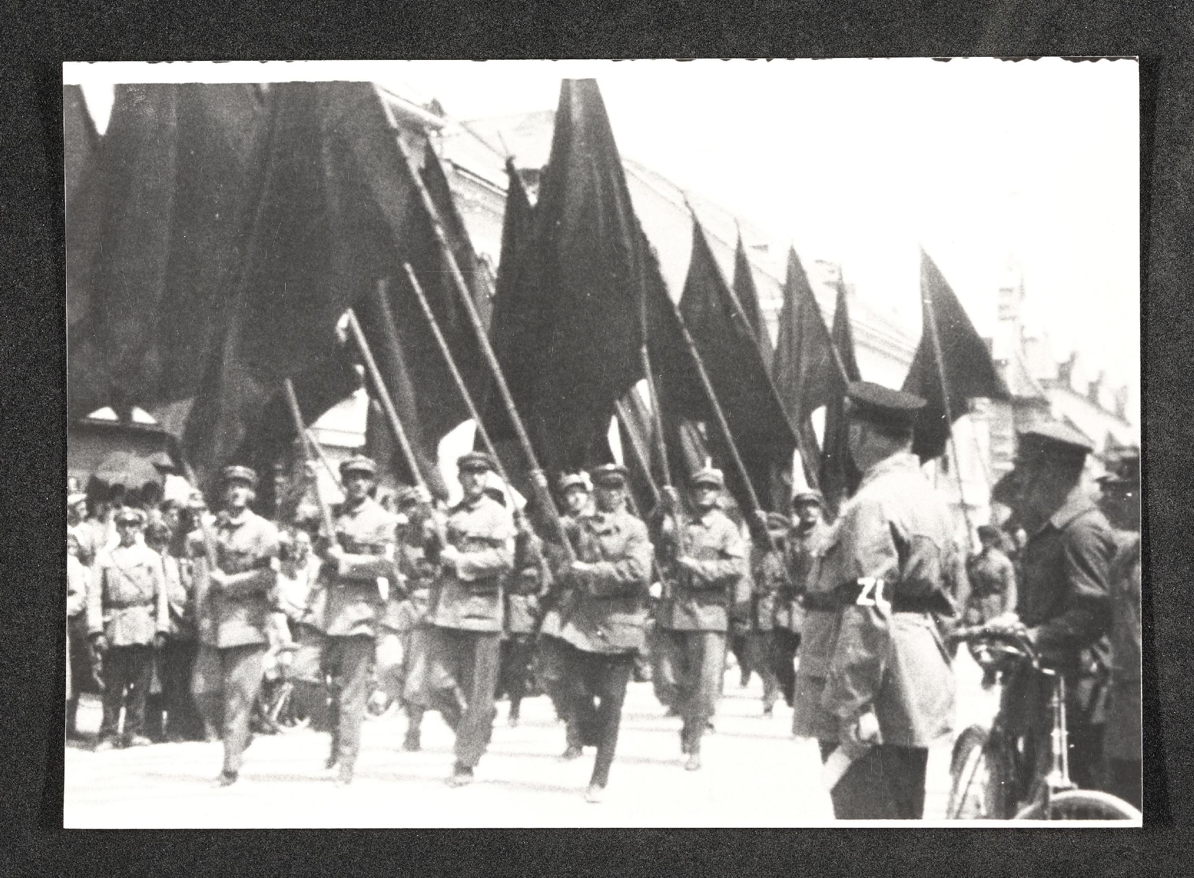 | Beschreibung | Uniformierte ziehen mit Fahnen durch eine Straße |