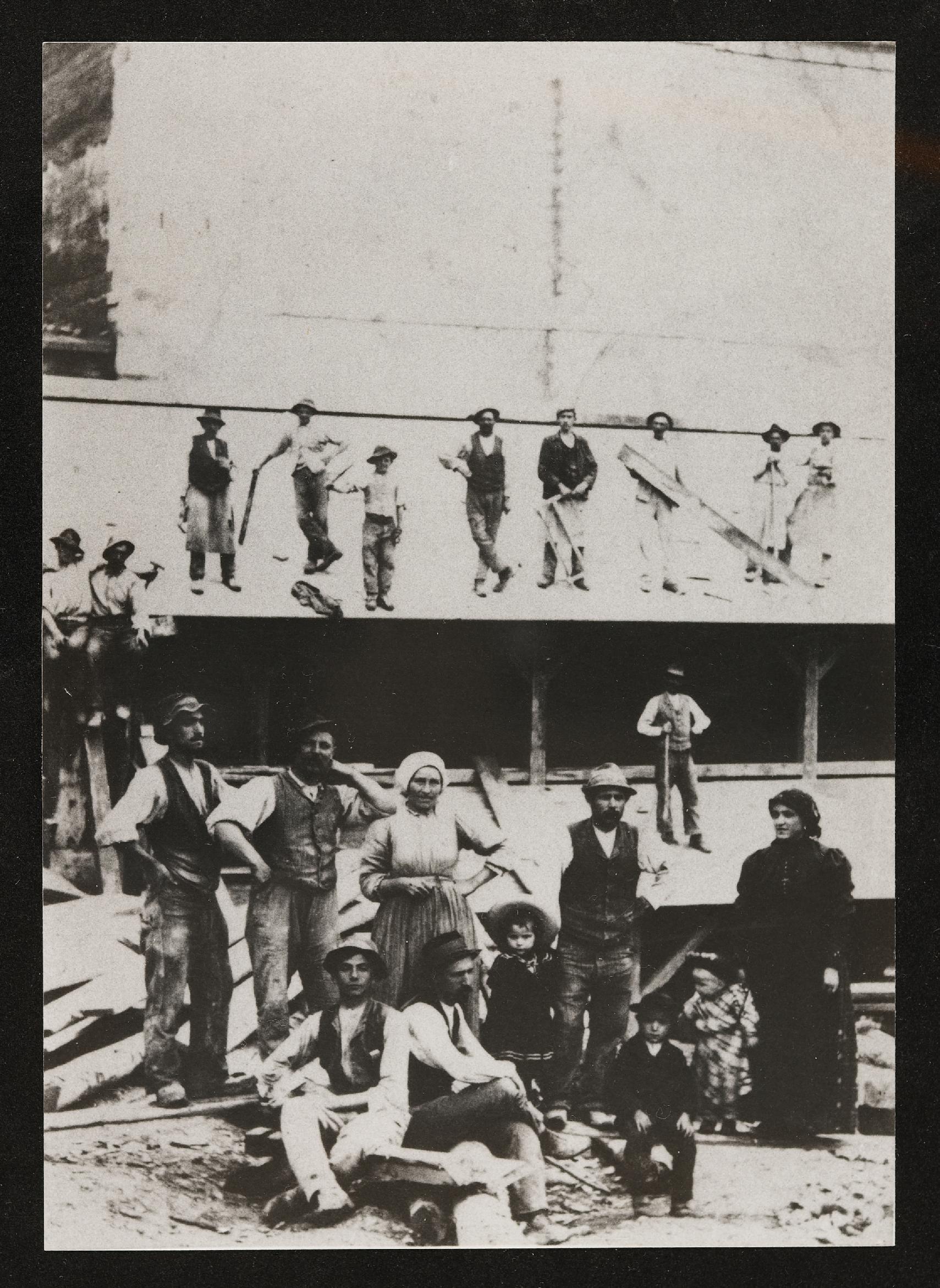 | Beschreibung | Arbeiterinnen und Arbeiter beim Bau eines Gebäudes |