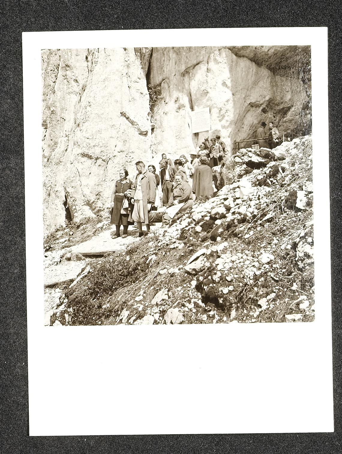 | Titel | Wandergruppe vor Höhleneingang |
