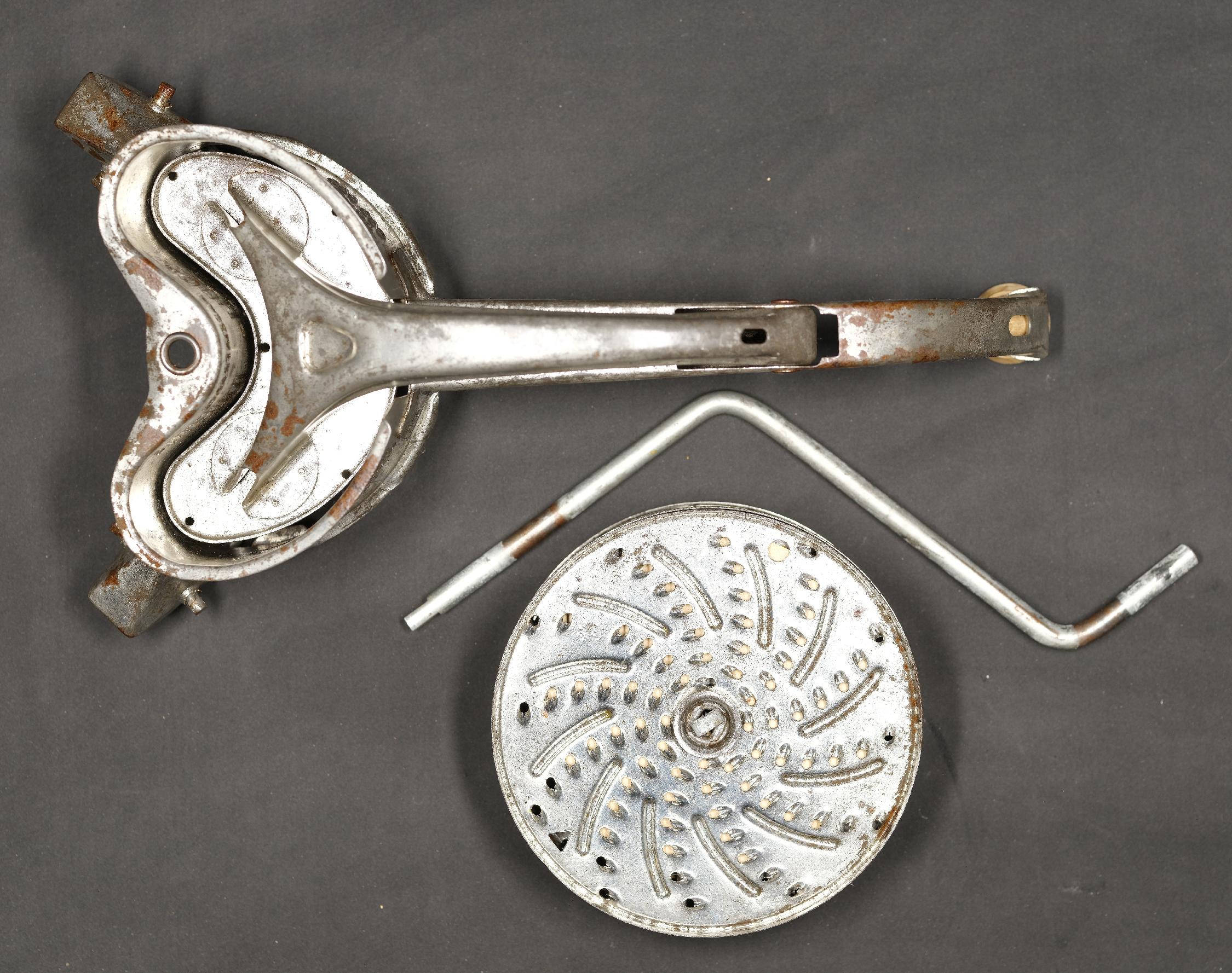 | Beschreibung | Handreibe Mouli Julienne, antiker französischer Gemüseschneider, dient zum Mahlen von Gemüse, Nüssen und Schokolade; Beschreibung |
