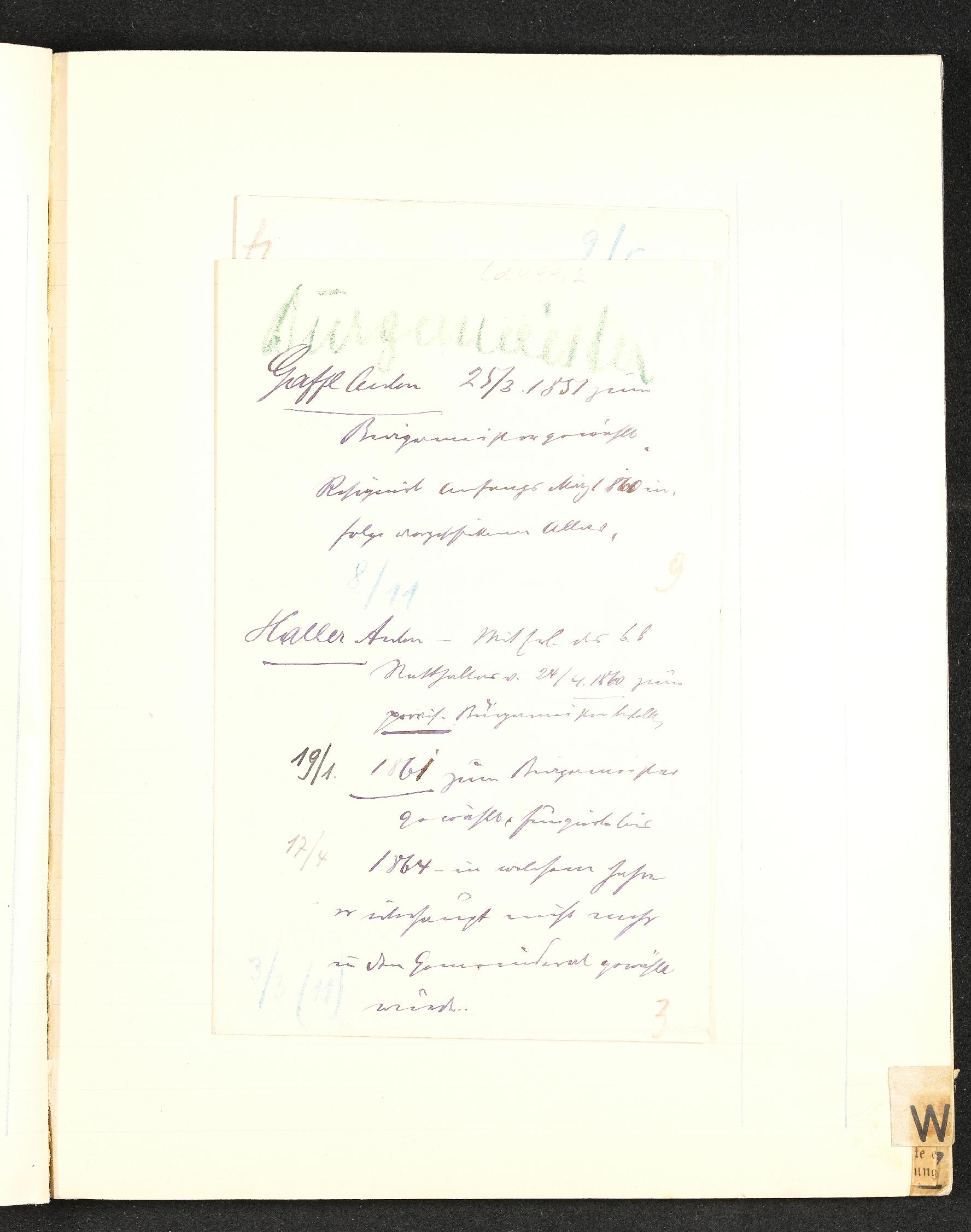 | Beschreibung | Buchstabenabschnitt W, eingeklebte Auflistung der Steyrer Bürgermeister ab 1851 bis 1919 |