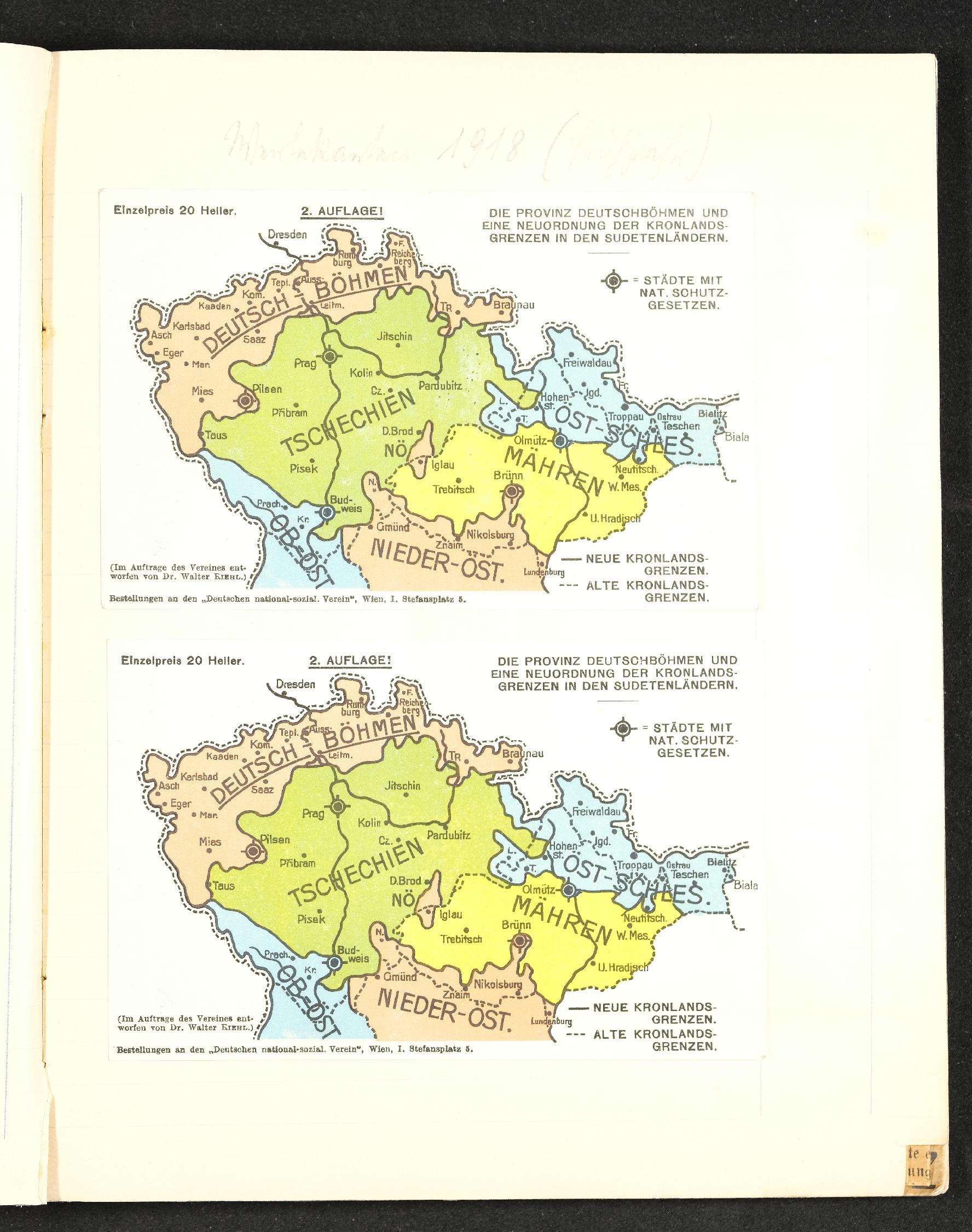 | Beschreibung | Buchseite mit zwei eingeklebten, identischen Ansichtskarten der sogenannten Sudetengebiete im Jahr 1918 |