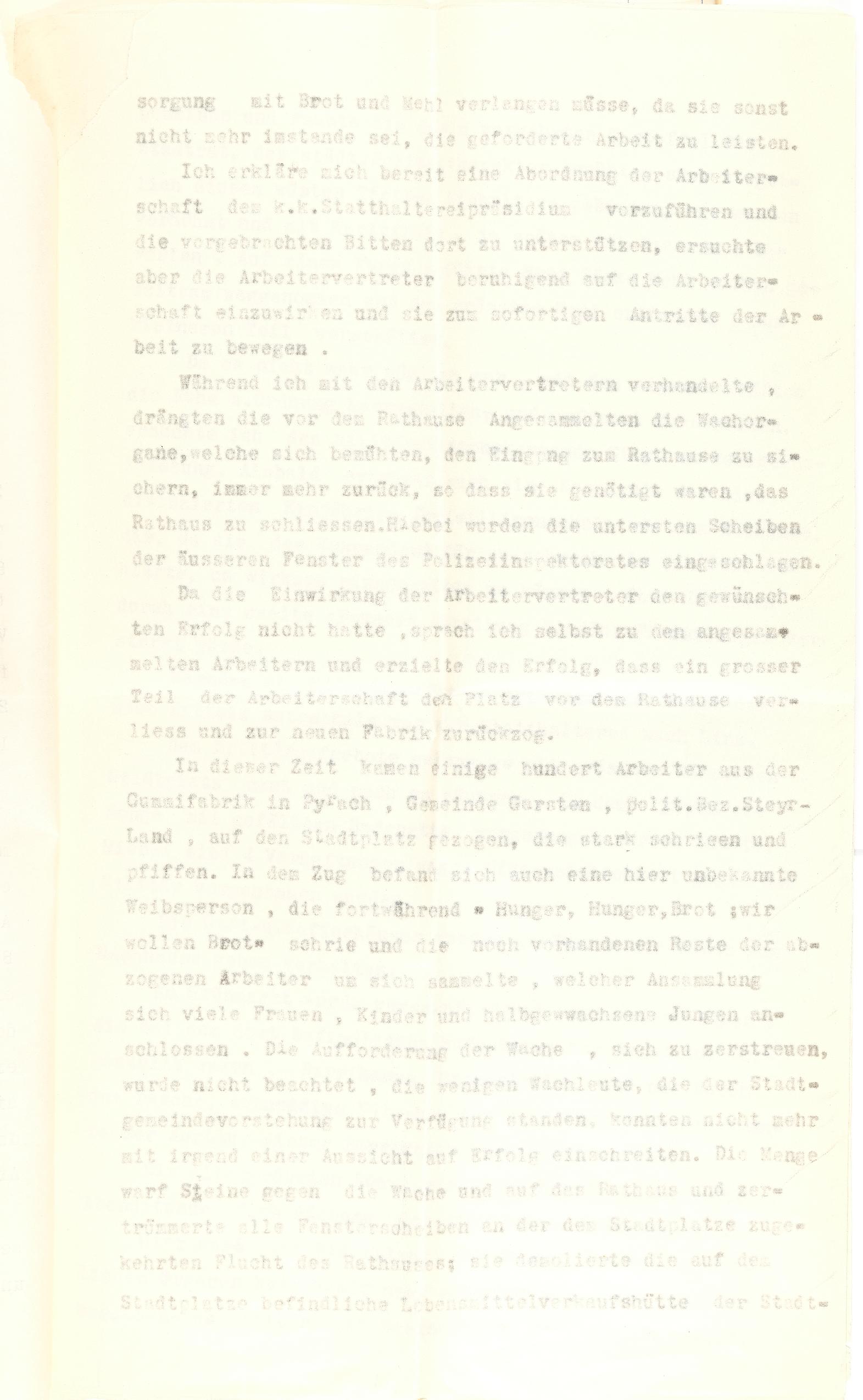 | Beschreibung | Seite 2 des Briefdurchschlages der Stadtgemeindevorstehung Steyr vom 15. September 1916 an das k.k.o.ö. Statthalterei-Präsidium in Linz, 6000 Menschen > Lebensmittelversorgung |