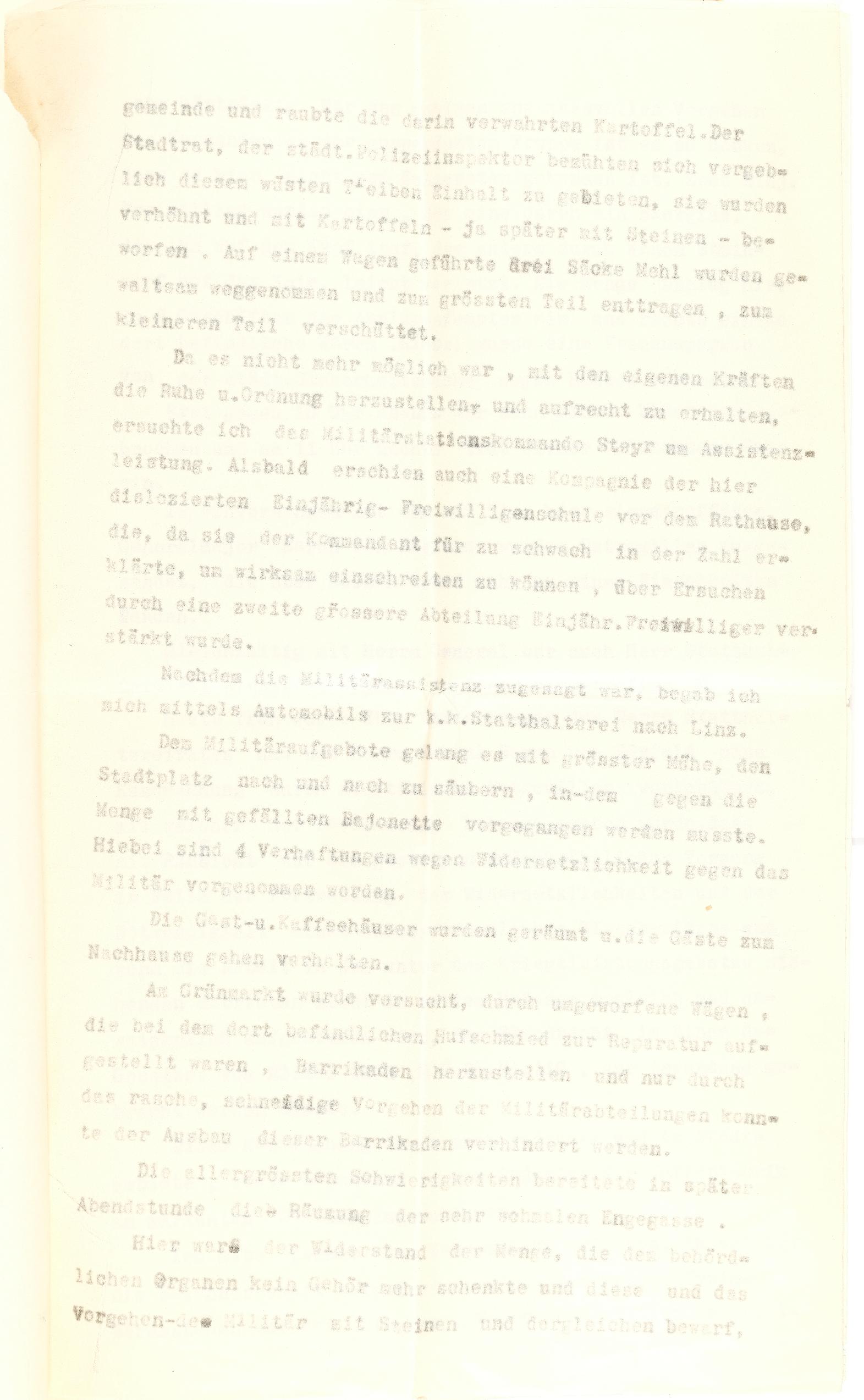 | Beschreibung | Seite 3 des Briefdurchschlages der Stadtgemeindevorstehung Steyr vom 15. September 1916 an das k.k.o.ö. Statthalterei-Präsidium in Linz, 6000 Menschen > Lebensmittelversorgung |