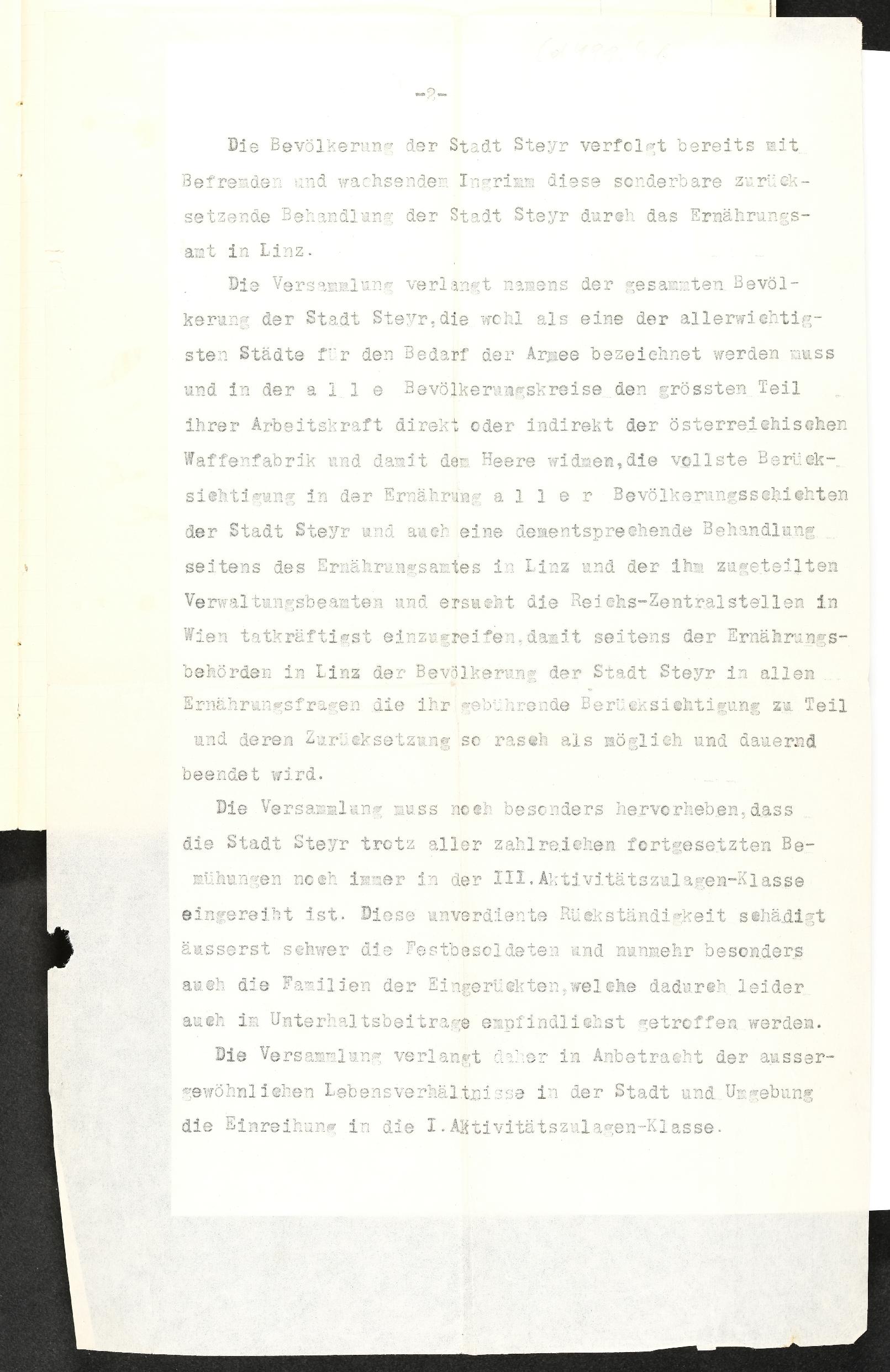 | Beschreibung | Seite 2 der im Tagebuch eingeklebten Entschliessung vom 23. August 1917 über die Lebensmittelversorgung in Steyr |