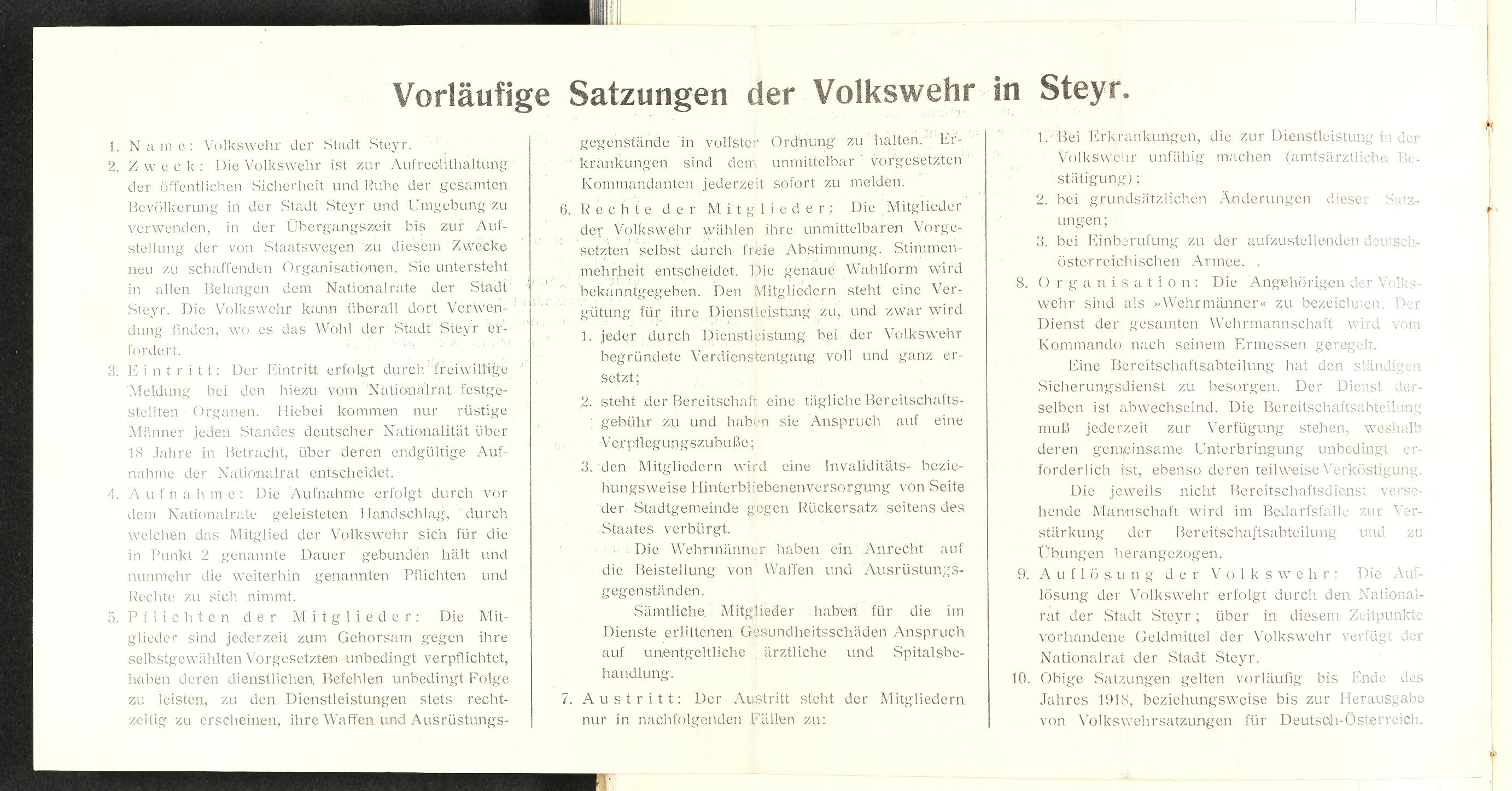 | Beschreibung | Vorläufige Satzungen (Vorderseite) der Volkswehr in Steyr vom 5. November 1918 |