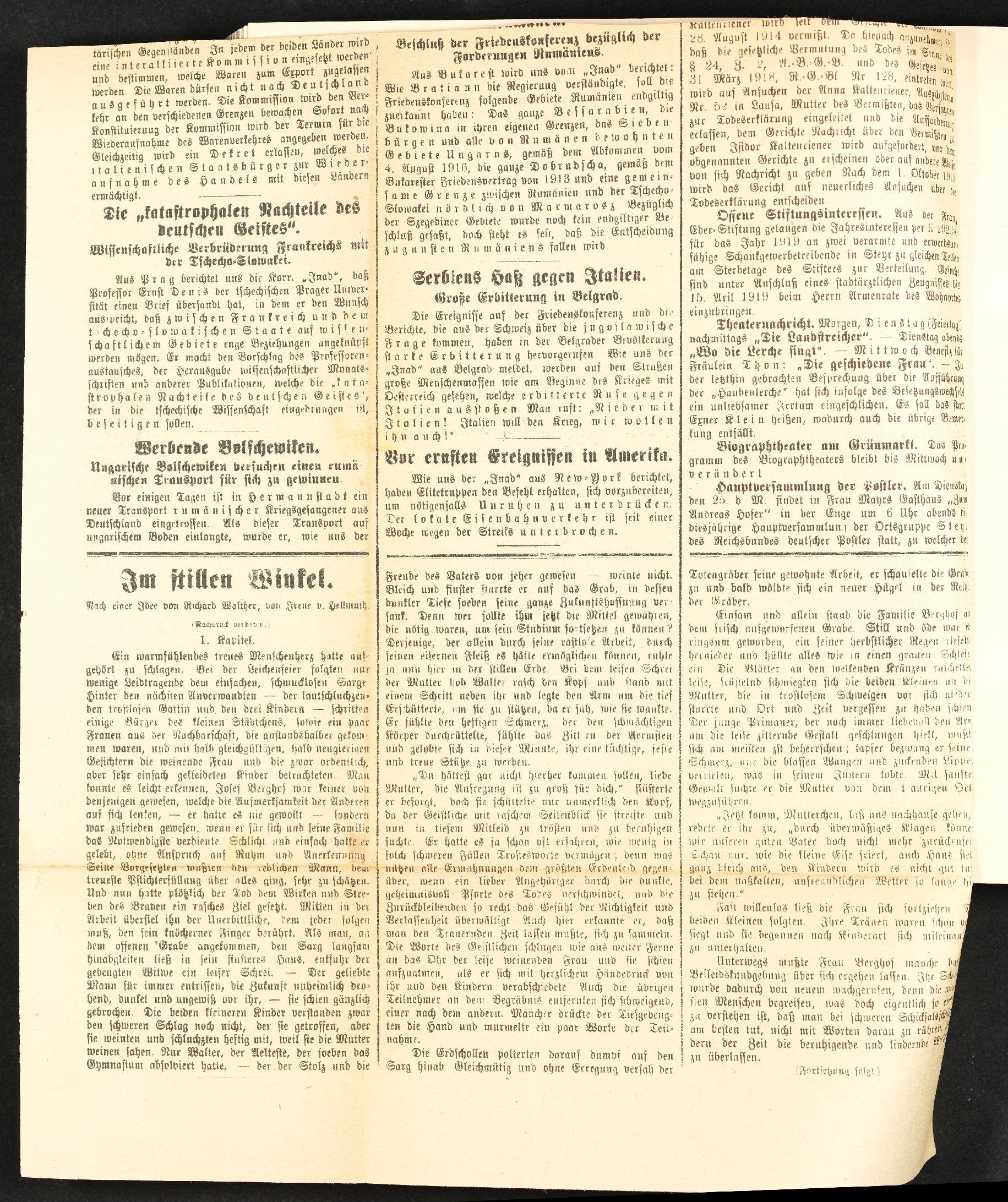 | Beschreibung | Rückseite des Zeitungsausschnittes aus dem Steyrer Tagblatt vom Montag, 24. März 1919, 20. Jahrgang mit kurzen Artikeln: Die "katastrophalen Nachteile des deutschen Geistes", "Werbende Bolschewiken" (nicht vollständig), "Beschluß der Friedenskonferenz bezüglich der Forderungen Rumäniens", "Serbiens Haß gegen Ialien", "Vor ernsten Ereignissen in Amerika" (nicht vollständig), verschiedene Kurznachrichten aus Steyr, 1.Kapitel von "Im stillen Winkel" nach einer Idee von Richard Walther, von Irene v. Hellmuth |