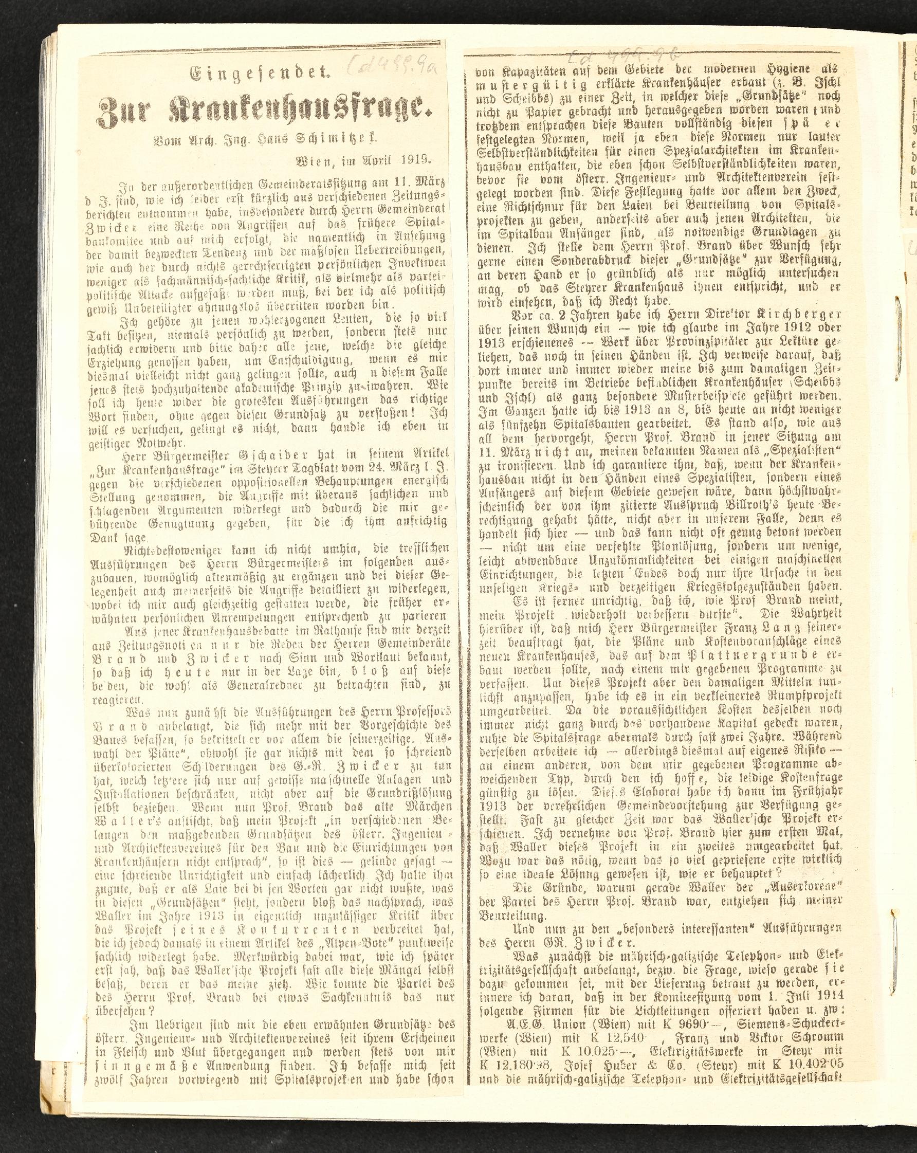 | Beschreibung | Buchseite mit eingeklebtem Zeitungsausschnitt: "Zur Krankenhausfrage" eingesendet vom Arch. Ing. Hans Schimitzek, Wien, im April 1919 |
