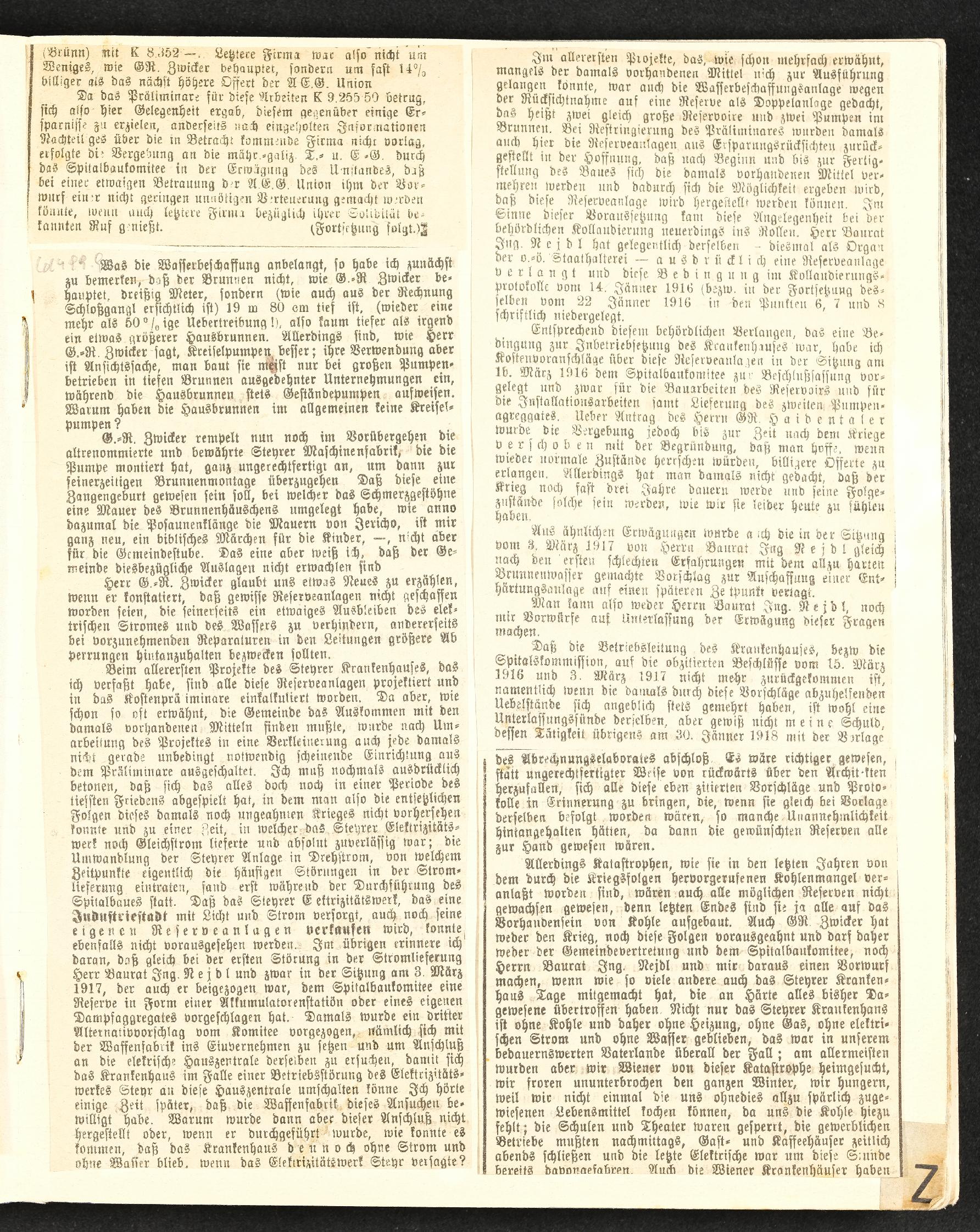 | Beschreibung | Buchstabenabschnitt Z, Buchseite mit eingeklebtem Zeitungsausschnitt: Fortsetzung "Zur Krankenhausfrage" eingesendet vom Arch. Ing. Hans Schimitzek, Wien, im April 1919 |