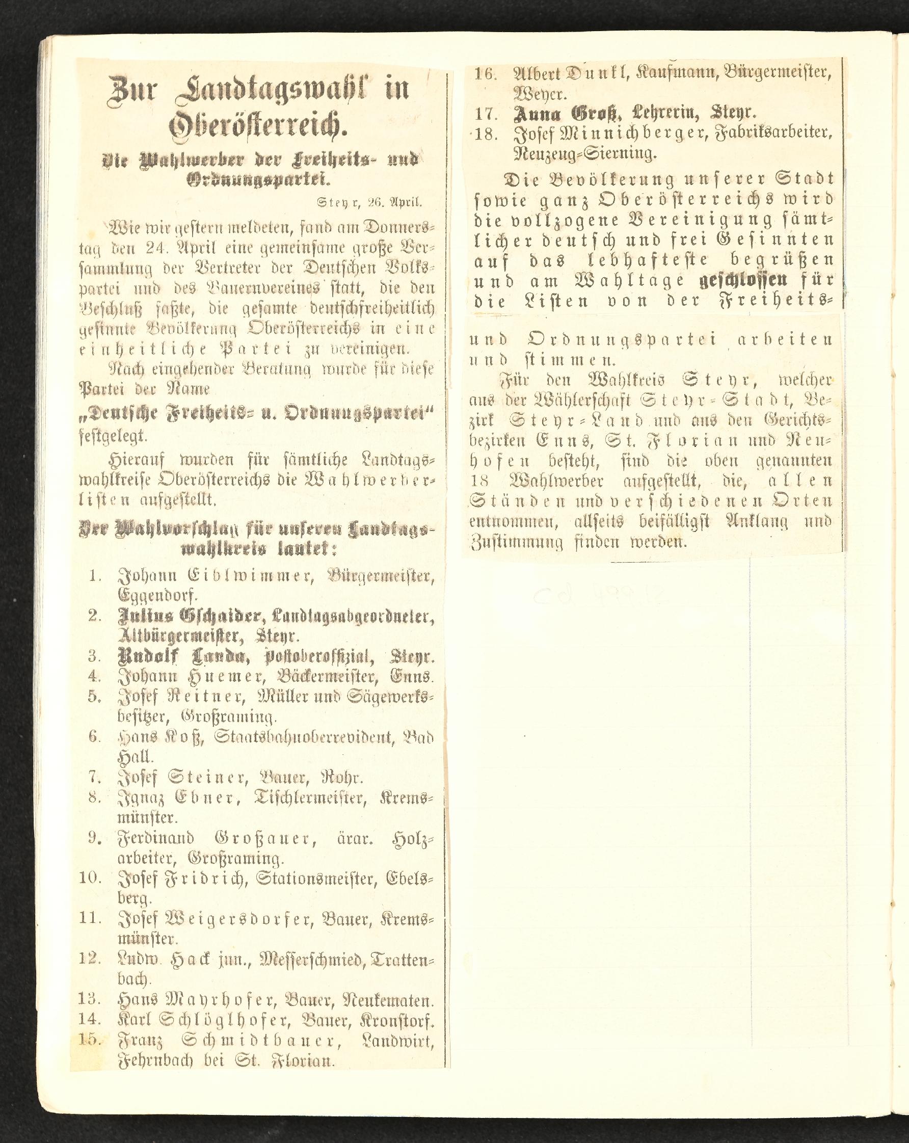 | Beschreibung | Buchseite mit eingeklebtem Zeitungsausschnitt "Zur Landtagswahl in Oberösterreich, Die Wahlwerber der Freiheits- und Ordnungspartei", Steyr, 26. April |