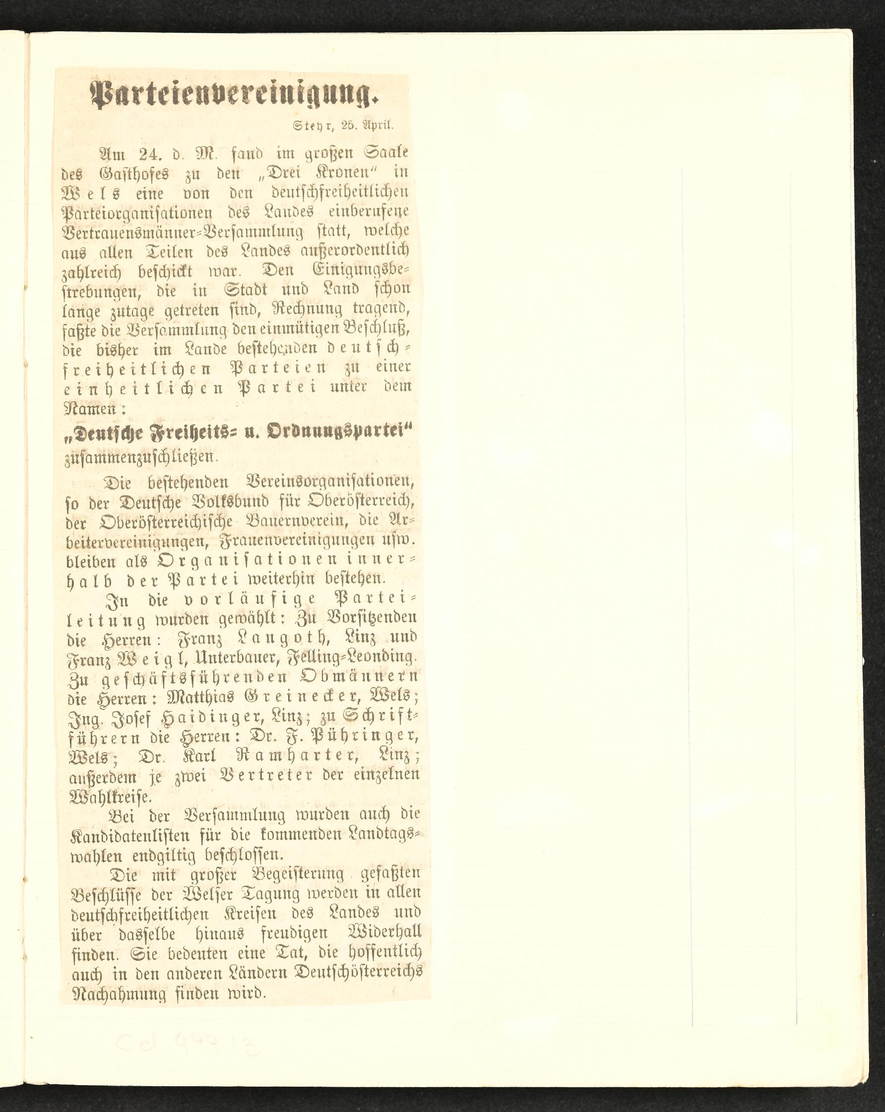 | Beschreibung | Buchseite mit eingeklebtem Zeitungsausschnitt "Parteienvereinigung", Steyr, 26. April |