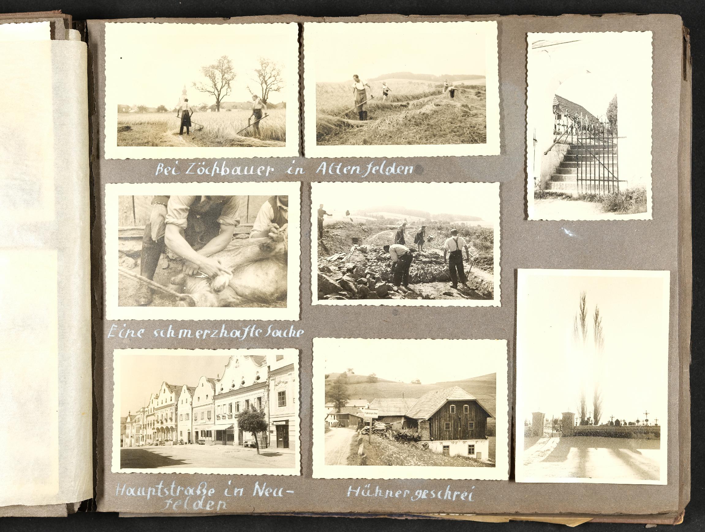 | Beschreibung | privates Fotoalbum mit Familienfotos, Freizeitfotos, Urlaubsfotos und Fotos aus dem Einsatz im 2. Weltkrieg, Privatfotos: "Bei Zöchbauer in Altenfelden", "Eine schmerzhafte Sache", "Hauptstraße in Neufelden", "Hühnergeschrei" (siehe Ortstafel) |