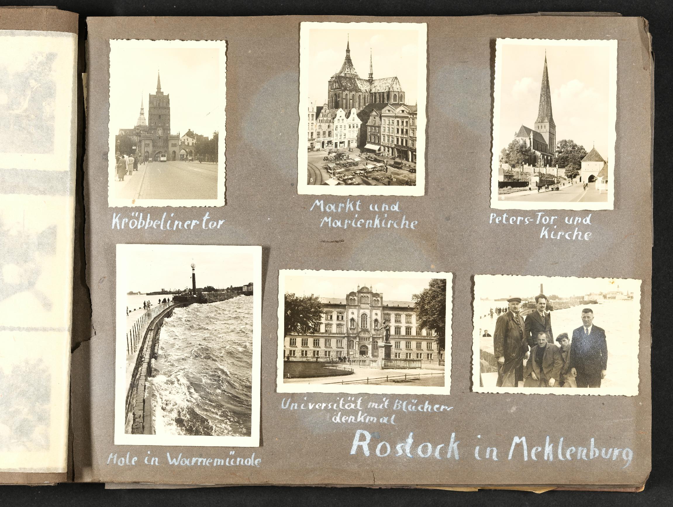 | Beschreibung | privates Fotoalbum mit Familienfotos, Freizeitfotos, Urlaubsfotos und Fotos aus dem Einsatz im 2. Weltkrieg, Fotos: "Rostock in Meklenburg: Kröbbelinertor, Markt und Marienkirche, Peters-Tor und Kirche, Universität mit Blücherdenkmal", "Mole in Warnemünde" |
