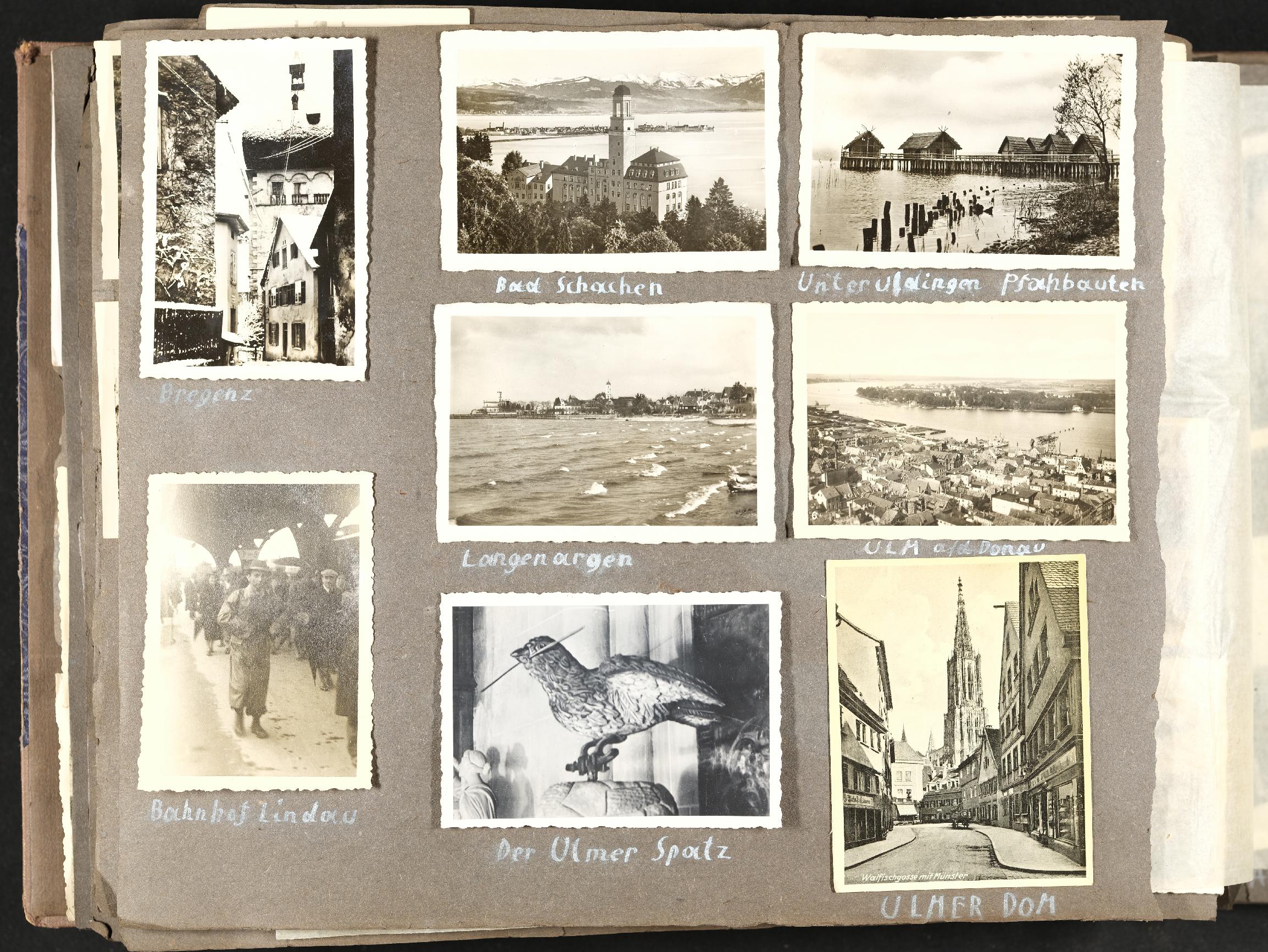 | Beschreibung | privates Fotoalbum mit Familienfotos, Freizeitfotos, Urlaubsfotos und Fotos aus dem Einsatz im 2. Weltkrieg, Fotos: "Bregenz", "Bad Schachen", "Unteruhldingen Pfahlbauten", "Bahnhof Lindau", "Langenargen", "Ulm an der Donau", "Der Ulmer Spatz", "Ulmer Dom" |