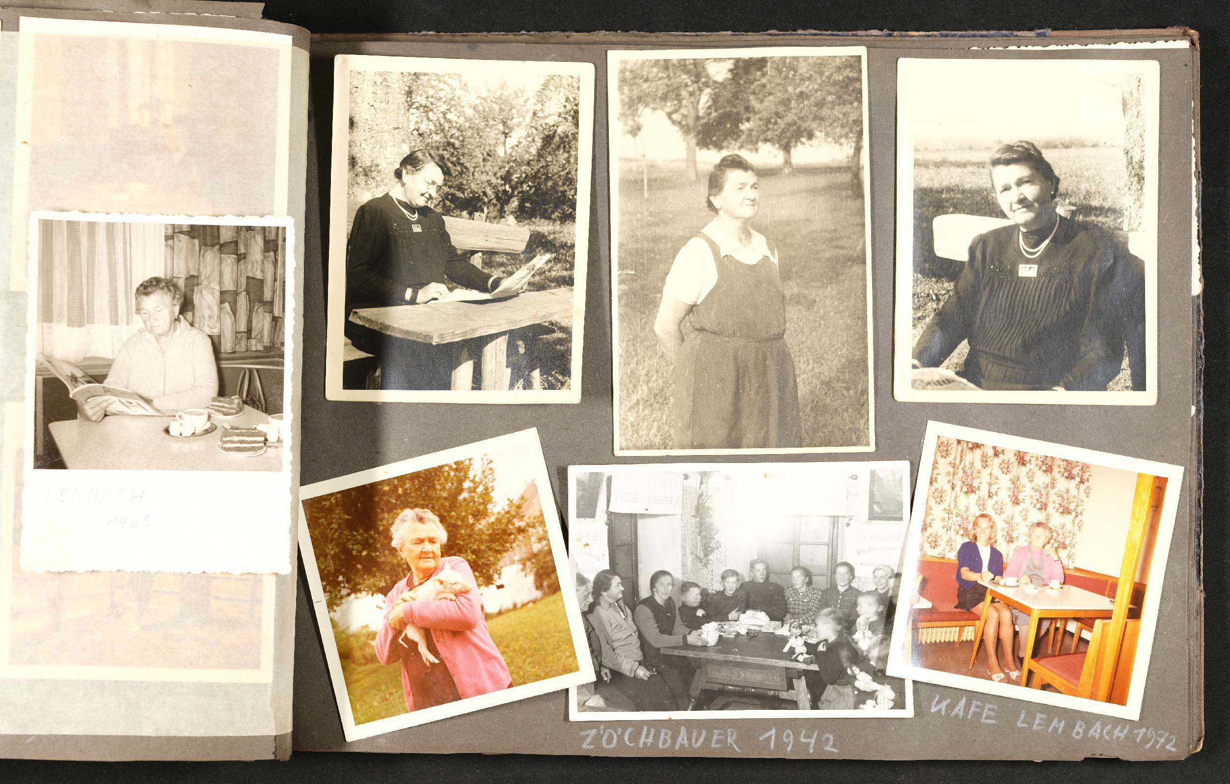 | Beschreibung | privates Fotoalbum mit Familienfotos, Freizeitfotos, Urlaubsfotos und Fotos aus dem Einsatz im 2. Weltkrieg, Fotos der Mutter, Familienfoto Zöchbauer 1942, im Café Lembach 1972 |