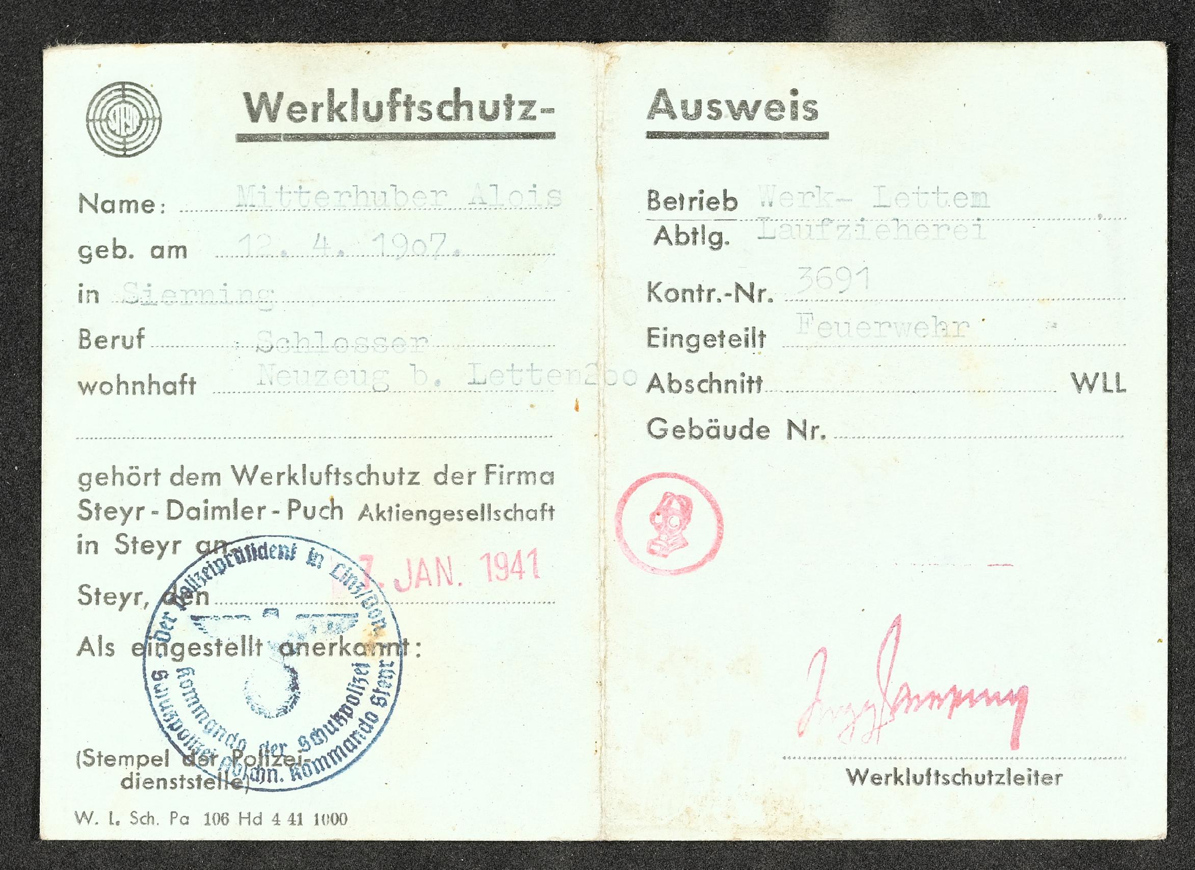 | Beschreibung | Werkluftschutzausweis der Steyr-Daimler-Puch AG für Alois Mitterhuber, geboren am 12. April 1907 in Sierning, von Beruf Schlosser. Er war eingeteilt bei der Feuerwehr im Werk Letten in der Abteilung Laufzieherei. Der ausweis wurde am 7. Jänner 1941 in Steyr ausgestellt. |