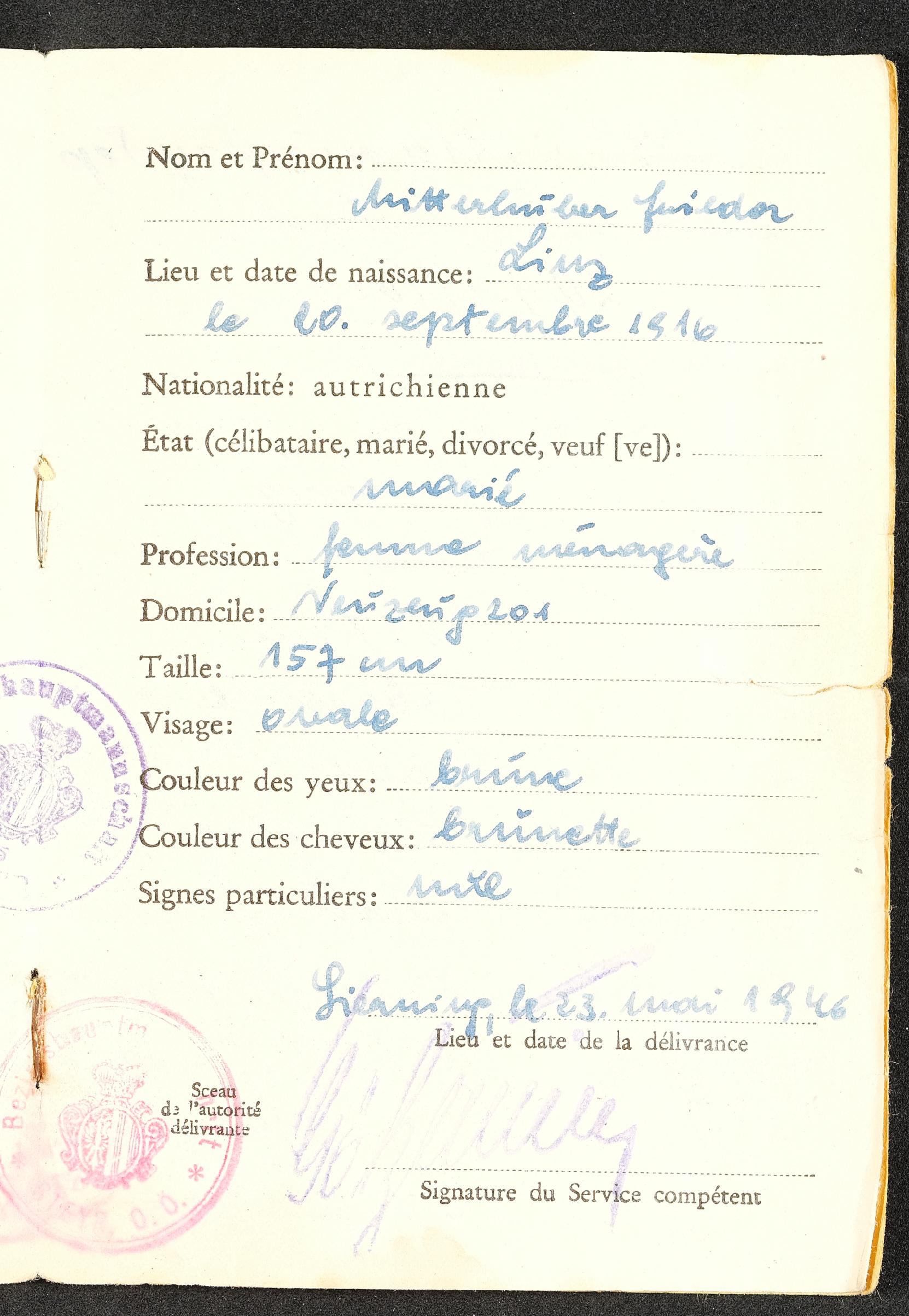 | Beschreibung | Identitätsausweis, ausgestellt am 23. Mai 1946, Ausweisinhaberin Mitterhuber Frieda (geboren am 20. September 1916). Genaue Personenbeschreibung und Foto enthalten. Inhalt wurde auf deutsch, englisch, französisch und russisch angegeben. Zusätzlicher Vermerk: Gilt nicht als Staatsbürgerschaftsnachweis. |
